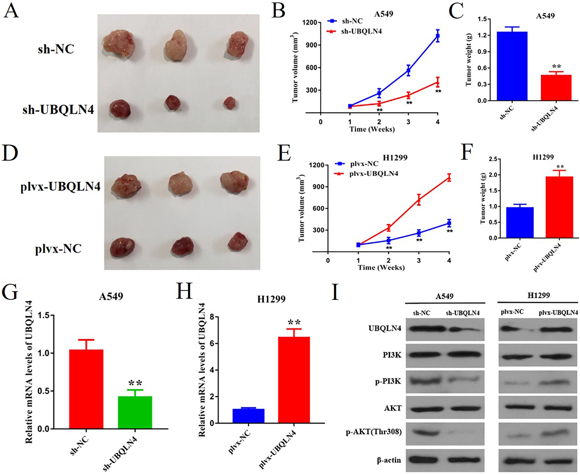 Nude mice aged 4 to 6 weeks were obtained from (the National Laboratory Animal Center (Beijing, China)), bred under specific pathogen-free conditions, and provided with distilled water for consumption. Under sterile conditions, 2×10^6 A549/H1299 cells in 120 µl PBS were injected into the inner thigh muscles of the left (plvx -NC/sh-NC) and right (plvx-UBQLN4/sh-UBQLN4) hind legs of each mouse, with three mice per group. The mice were observed daily for general conditions.