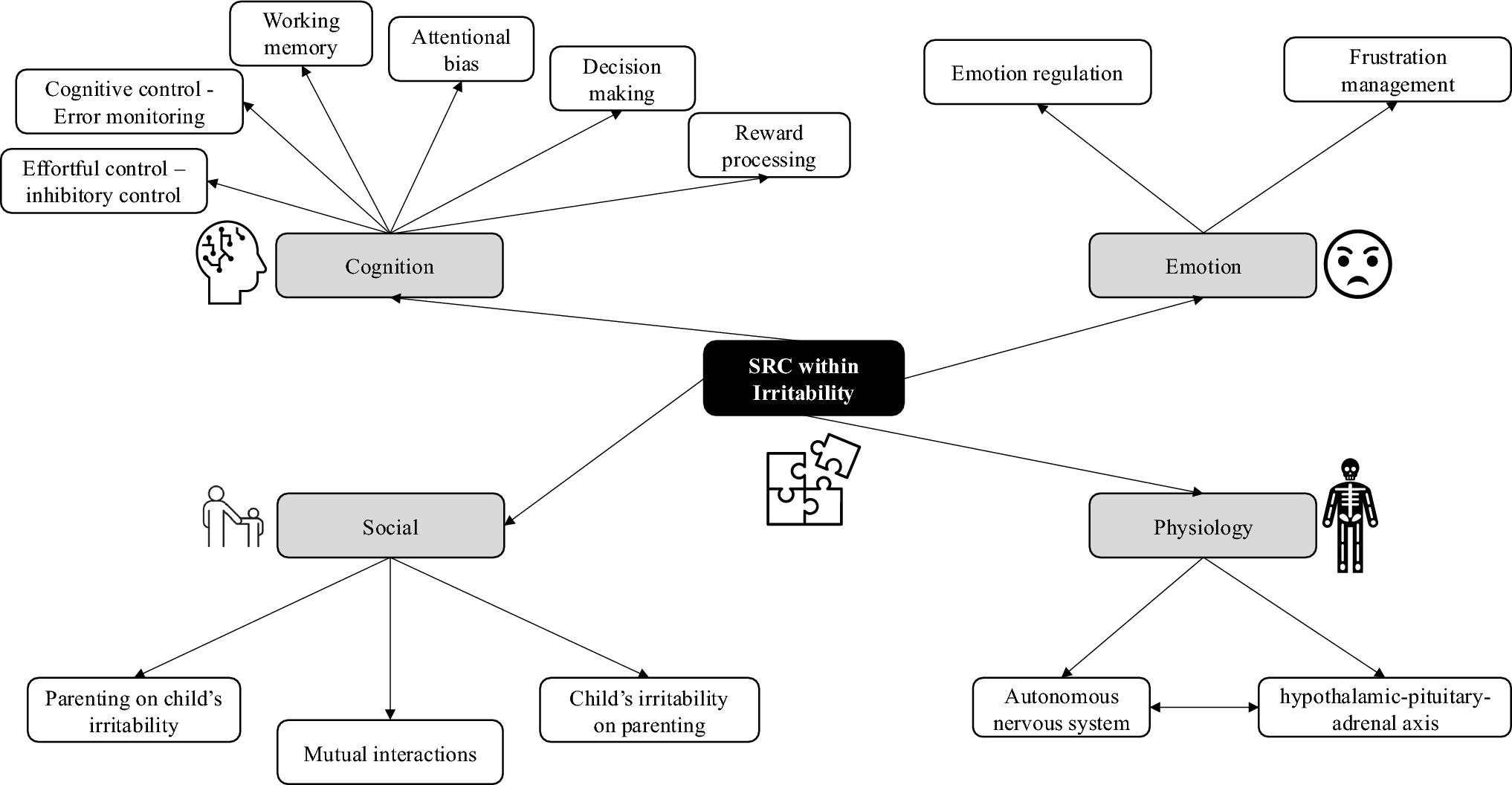 The last group of reports examined, mainly through parent–child interactions, links between childhood irritability and the social aspects of SRC (co-regulation). Notably, negative parenting [