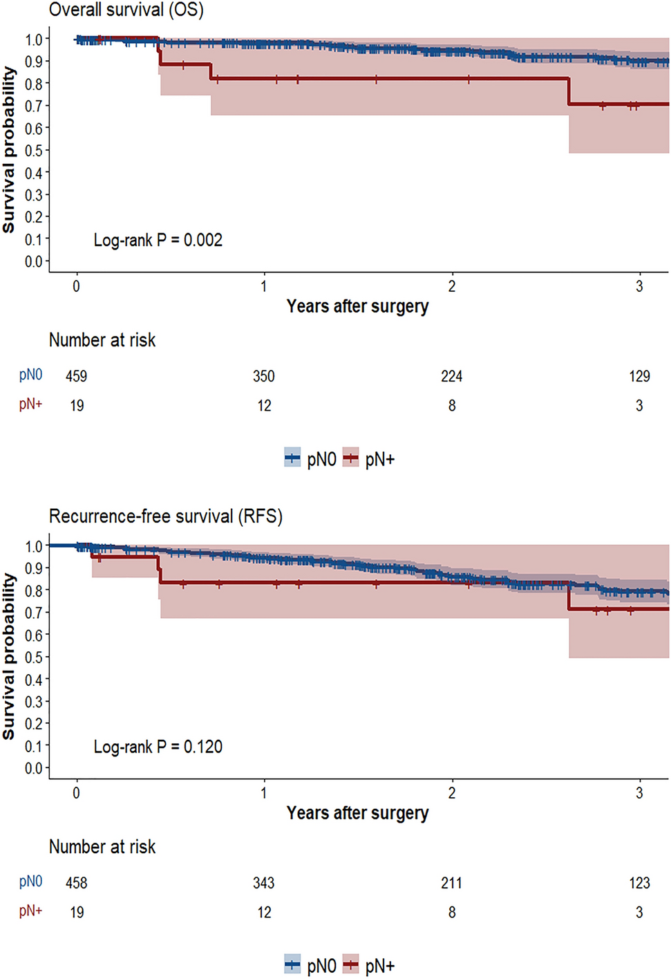 Overall survival and recurrence-free survival between pN0 and pN + subgroups
