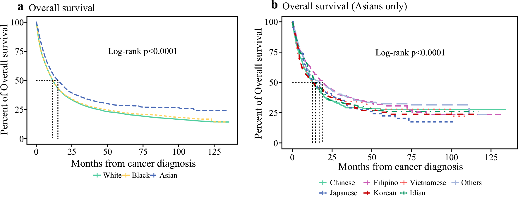 Our primary outcome was median overall survival, stratified by race/ethnicity. Independent variables derived from the NCDB included race/ethnicity, age, gender, distance to treatment facility, income, Charlsen–Deyo comorbidity index, and insurance status.
