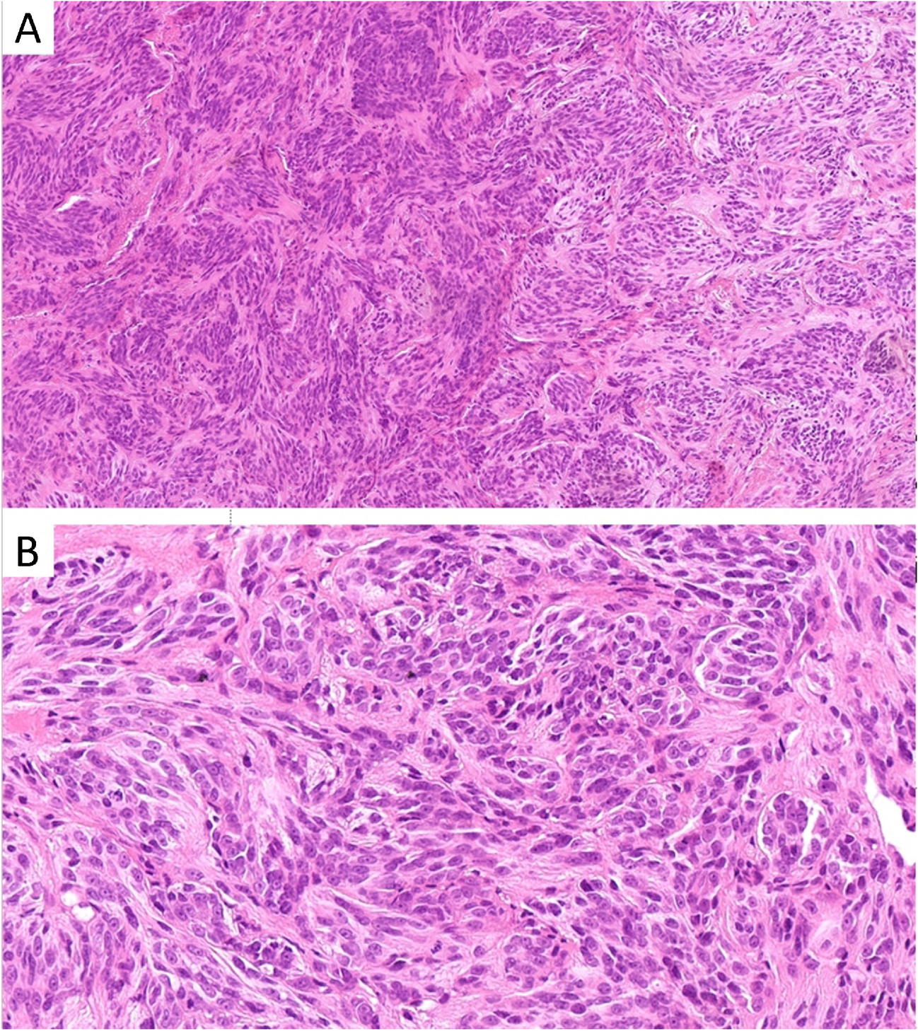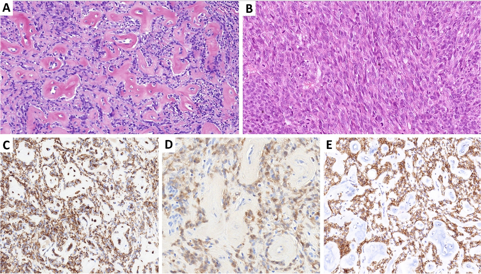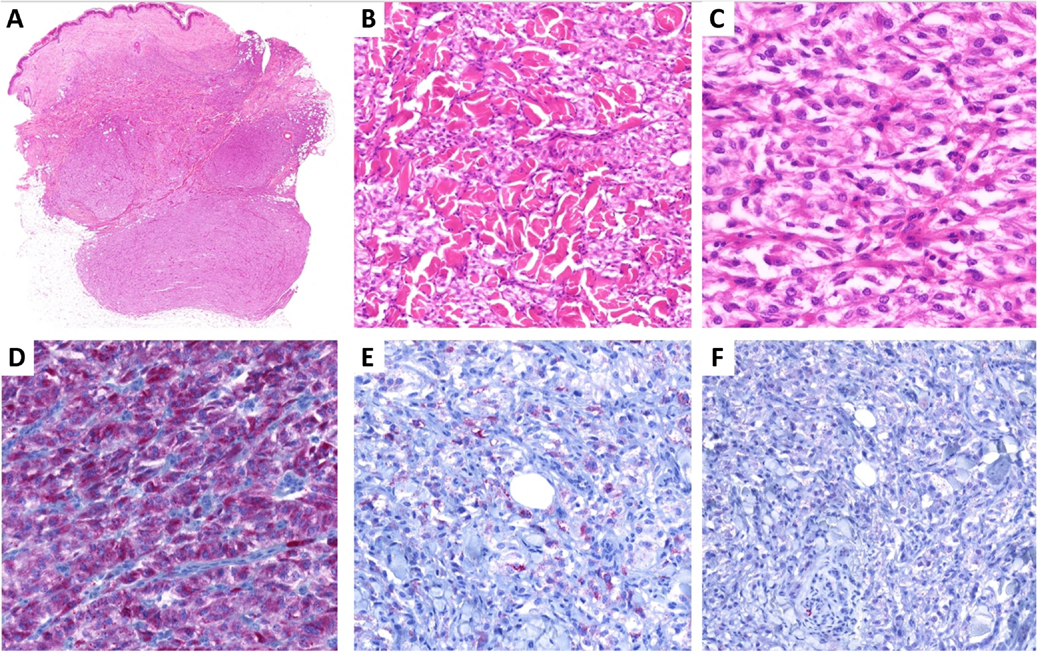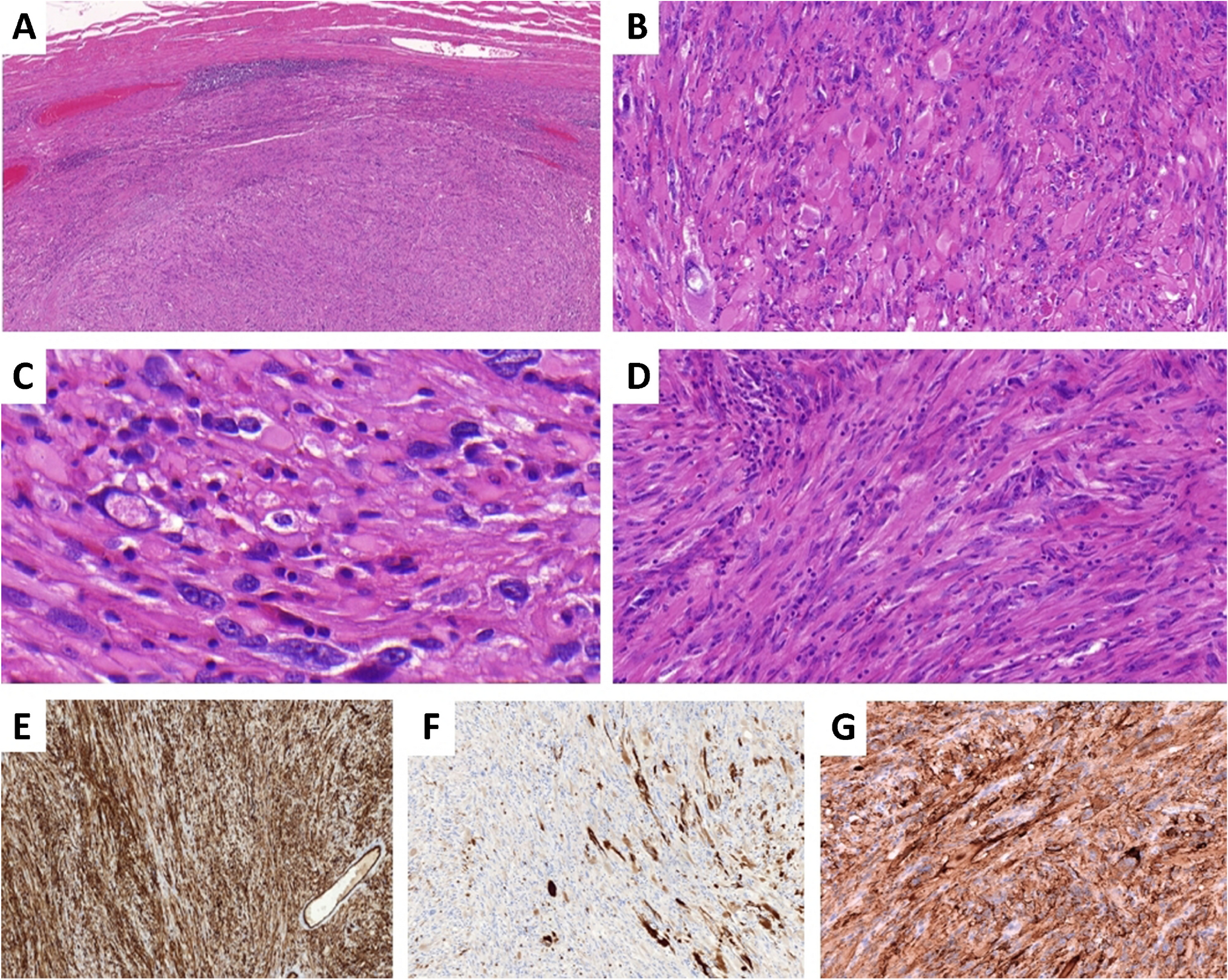 Superficial CD34+ fibroblastic tumor | - Adolescents or young adults - Proximal limbs (particularly thigh) | - Well-circumscribed dermal/subcutaneous tumor - Sheets/bundles of epithelioid/spindle cells with marked pleomorphism and frequent nuclear pseudoinclusions - Abundant, markedly eosinophilic, granular to glassy cytoplasm - Usually low mitotic activity and lack of atypical mitoses | - All cases: CD34 and SynCam3 positivity - ≈ 70-80%: focal/patchy keratin expression - ≈ 2/3 of cases: N-terminus WT-1 positivity | PRDM10 fusions with CITED2, MED12, ARHGAP32 or RAD30 genes | - Indolent - Rare LR and LN mets | - UPS - Pleomorphic liposarcoma - DFSP - Myxoinflammatory fibroblastic sarcoma - Atypical cellular FH |
