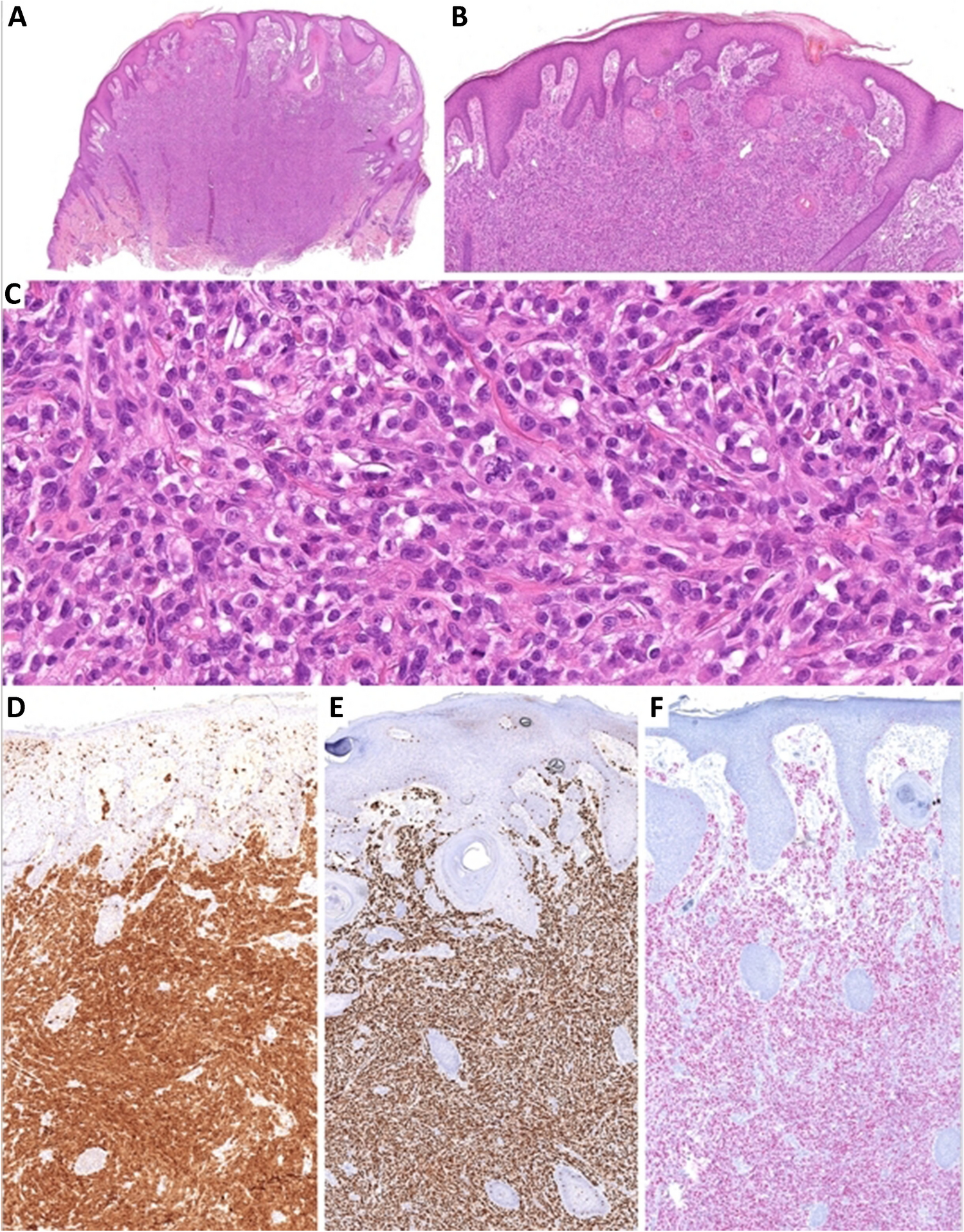 MITF::CREM tumor | - 3 reported cases: - 2 newborns (one F, one of unknown gender), 1 adult F - Locations: Scalp (n=2), hand (n=1) | - Dermal nodule with some subcutaneous extension - Infiltrative growth - Two cases abutting the epidermis but no intraepidermal component - Solid sheets, small nests, or bundles of epithelioid to spindle cells with moderate atypia, prominent nucleoli - Eosinophilic or clear cytoplasm - Variable mitotic activity (4-11 mitoses/10 HPF), occasional atypical forms | - 3/3 tested cases: S100, SOX10 positive - 2/2: MITF and HMB-45 positive - Melan A: 2/3 cases positive | MITF::CREM fusion | - 1/3 case recurred locally at 9m, NED 23m later - 2/3 cases NED 9 and at 39m | - Cellular blue nevus - Melanoma - Clear cell sarcoma - PEComa - CRTC1::TRIM11 tumors |