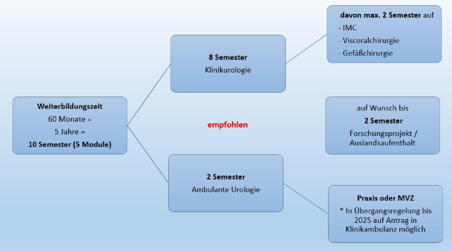 Die Mindestweiterbildungszeit für den Facharzt für Urologie beträgt auch nach der neuen Weiterbildungsordnung weiterhin 60 Monate (5 Jahre). Es bietet sich eine Unterteilung in Halbjahre an, so dass dann insgesamt 10 Semester zur Vermittlung der Weiterbildungsinhalte zur Verfügung stehen. Eine der größten Veränderungen in der MWBO stellt die klare Verlagerung der geforderten Kompetenzen in den ambulanten Bereich der Urologie dar. Dieser Veränderung sollte auch in der Umsetzung der MWBO Rechnung getragen werden. Deshalb empfiehlt das Curriculum, 2 Semester im ambulanten Sektor zu absolvieren, z. B. durch eine Rotation in eine Praxis oder ein medizinisches Versorgungszentrum (MVZ). Dafür ist es notwendig, Kooperationen und Allianzen zwischen den Akteuren zu bilden, im Rahmen derer den Weiterbildungsassistenten entsprechende intersektorale Rotationen ermöglicht werden können. Da solche Veränderungen bis zur finalen Umsetzung zumeist einiger Zeit bedürfen, soll eine Praxisrotation durch eine Übergangsregelung bis 2025 auch in Klinikambulanzen möglich sein. Die verbleibenden 8 Semester sollten im Bereich der stationären Urologie abgeleistet werden. Dabei können fakultative Rotationen von maximal 2 Semestern auf eine Wachstation (IMC), die Viszeral- oder die Gefäßchirurgie angeboten werden (Abb. 1). Hier könnte ein Austausch von Weiterbildungsassistenten zwischen Universitätskliniken/Kliniken mit voller Weiterbildungsermächtigung und Schwerpunkt- und Regelversorgern erfolgen, wenn die entsprechenden Semester beispielsweise im eigenen Haus nicht angeboten werden können. Auf Wunsch des Assistenzarztes können 2 Semester zur Bearbeitung eines speziellen Forschungsprojekts genutzt werden, wodurch sich jedoch die Weiterbildungszeit, je nach Anerkennungsmöglichkeiten an der entsprechenden Klinik, gegebenenfalls verlängern kann. Auf diese Weise kann eine volle und individuell gestaltete Weiterbildung, evtl. wie beschrieben auch im Rotationsaustauschprogramm mit anderen urologischen Kliniken und Praxen, angeboten werden.