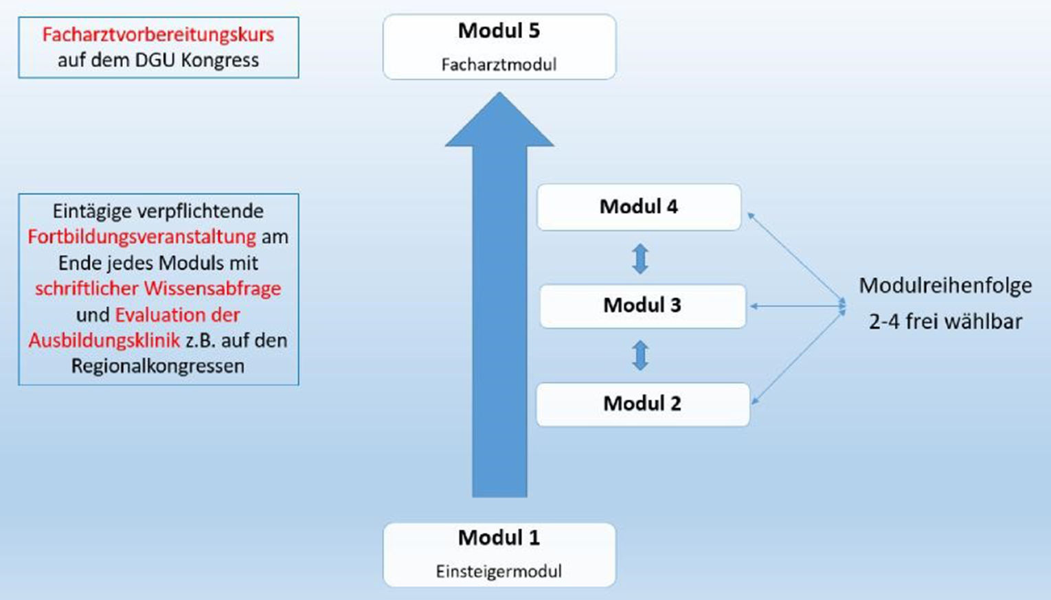 In vielen europäischen Ländern sind sowohl die Rotation durch verschiedene Ausbildungsstätten, als auch das Absolvieren mehrerer Zwischenprüfungen vor der Facharztprüfung Standard [3]. Durch das zertifizierte Curriculum kommt die DGU dem Wunsch nach einer transparenteren und objektiver gestalteten Abfrage der Weiterbildungsinhalte durch eine schriftliche Prüfung zum Ende jedes Moduls im Rahmen der Fortbildungsveranstaltungen nach [5]. Durch die ebenfalls über eine Online-Plattform für alle Teilnehmer zugängliche Evaluation der Weiterbilder soll eine ständige Verbesserung der Weiterbildung in allen Ausbildungsstätten angeregt werden.