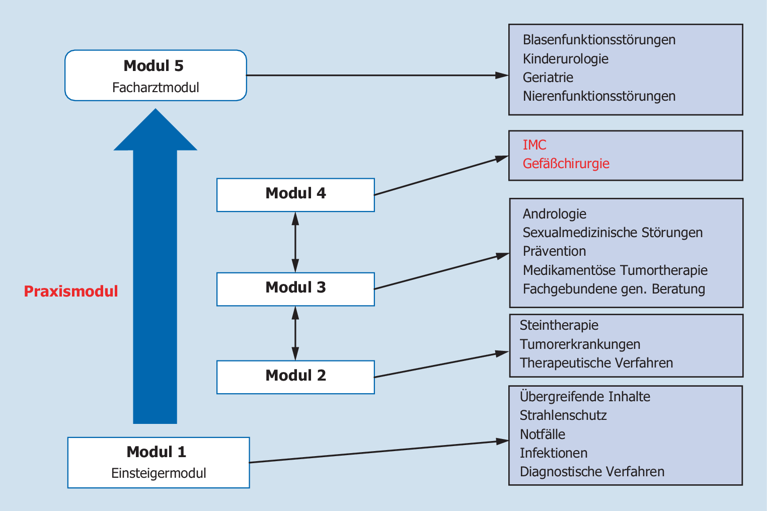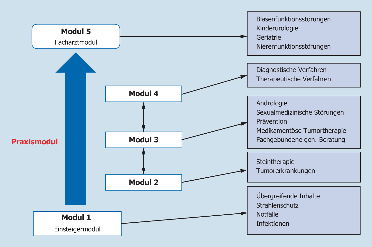 Während der gesamten Weiterbildungszeit werden insgesamt 10 Semester durchlaufen. Fasst man hiervon jeweils 2 Semester (also 1 Weiterbildungsjahr) zusammen, so ergeben sich daraus 5 Module, in denen die Weiterbildungsinhalte vermittelt werden können. Die einzelnen Module sollten individuell so konzipiert sein, dass sie in Summe alle durch die MWBO vorgegebenen Schwerpunkte der Weiterbildung abbilden. Modul 1 stellt dabei das sog. Einsteigermodul dar, das immer als erstes durchlaufen werden sollte und in dem – neben einigen speziellen Inhalten – v. a. grundlegende Kenntnisse und Fähigkeiten der Urologie vermittelt werden sollen. Die Module 2–4 können im Anschluss in ihrer Reihenfolge vom Weiterbildungsassistenten frei gewählt und in ihren Inhalten den Schwerpunkten des Arbeitsplatzes, beispielsweise auch im Rahmen einer Rotation, angepasst werden. Modul 5 sollte von allen Weiterbildungsassistenten als letztes Modul durchlaufen werden und eine optimale Vorbereitung auf die Facharztprüfung ermöglichen (Abb. 2). Um die regelmäßige fachliche Fortbildung der Weiterbildungsassistenten zu unterstützen und zu fördern, ist am Ende jedes Moduls eine eintägige Fortbildung vorgesehen, an deren Ende eine schriftliche (Module 1–4) oder mündliche (Modul 5, Facharztvorbereitungskurs) Wissensabfrage erfolgt. Diese modulspezifischen Fortbildungen könnten vorzugsweise im Rahmen der großen deutschen urologischen Kongresse stattfinden (UroAktuell, DGU-Kongress, evtl. Regionalkongresse). Unabhängig davon wird selbstverständlich der Besuch zusätzlicher Fortbildungsveranstaltungen begrüßt. Im Rahmen der modulspezifischen Fortbildungen können zudem die Ausbildungskliniken von den Weiterbildungsassistenten evaluiert werden.