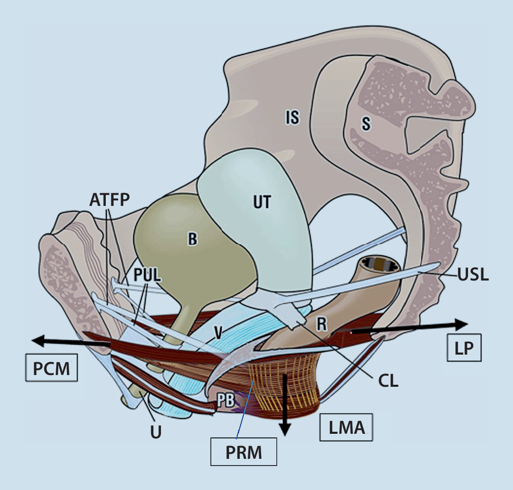 Wichtige Ligamente des Beckenbodens: PUL pubourethrales Ligament, ATFP Arcus tendineus fasciae pelvis, CL kardinales Ligament, USL uterosakrales Ligament, PB Perinealkörper. Wichtige Muskeln des Beckenbodens: PCM M. pubococcygeus, LMA longitudinaler Muskel des Anus, LP Levatorplatte, PRM M. puborectalis, U Urethra, B Blase, Ut Uterus, V Vagina, R Rektum, PB Perinealkörper. Die schwarzen Pfeile geben die Zugrichtungen an. (Mod. nach Petros [9])