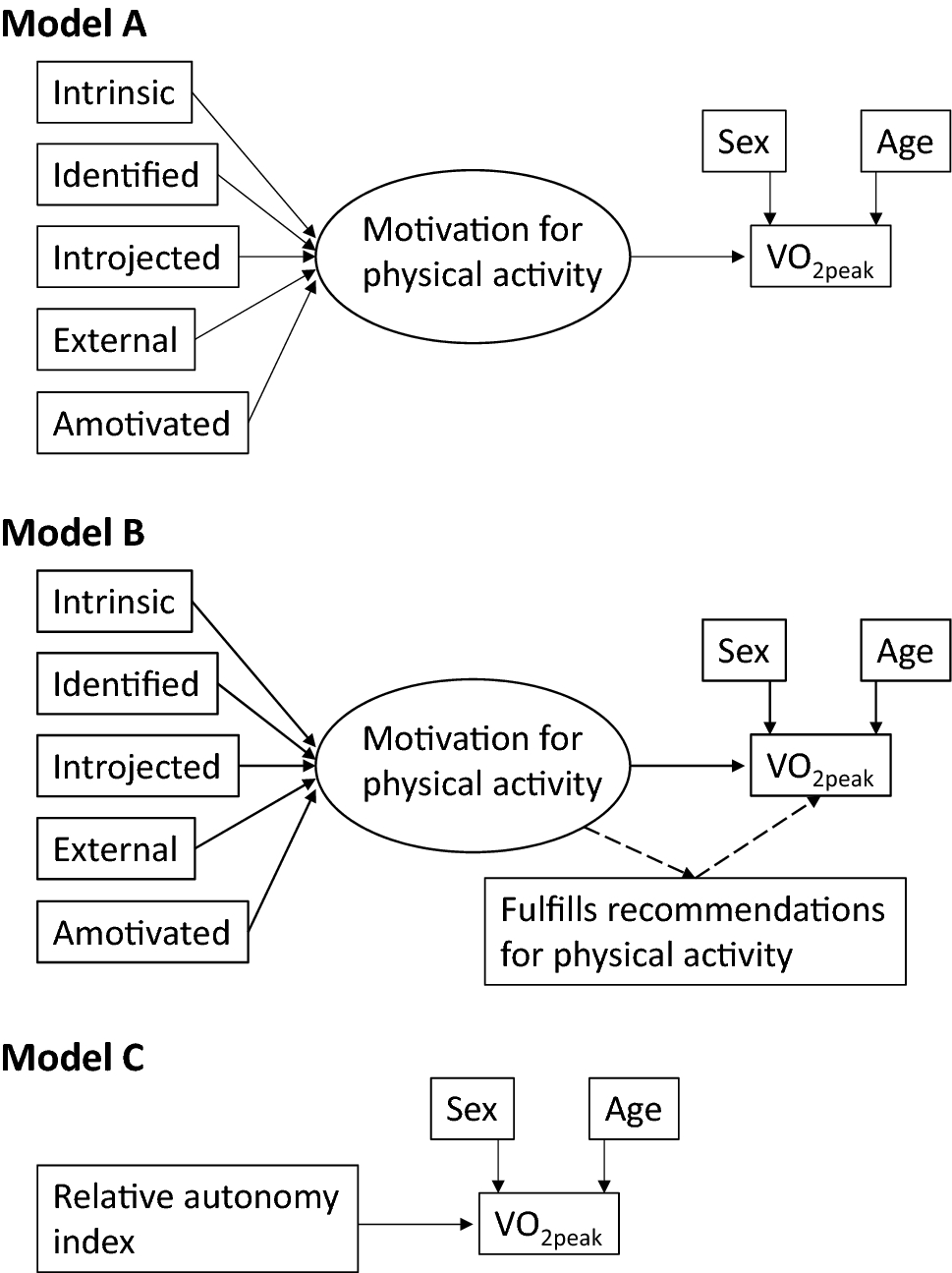Models for associations of motivation for physical activity and cardiorespiratory fitness. Model A assumes that the BREQ-2 factors together define a latent factor Motivation for physical activity, which in turn predicts the measured VO2peak. Model B assumes that whether the person fulfills the ACSM/AHA recommendations for physical activity (yes/no) is a mediator for the effect of this predictive latent factor. Model C assumes that the calculated relative autonomy index from the BREQ-2 factors may substitute for the individual BREQ-2 factors and the latent Motivation factor. All models were adjusted for sex (0 = woman, 1 = man) and age (years). Coefficients were standardized and their size is therefore directly comparable. ACSM American College of Sports Medicine, AHA American Heart Association, BREQ-2 Behavioral Regulation in Exercise Questionnaire-2, VO2peak peak oxygen uptake