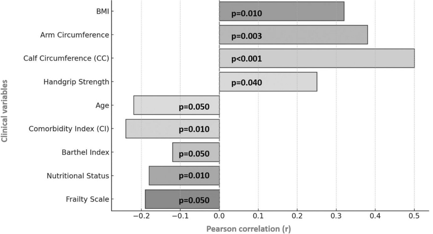 POCUS RFM muscle thickness showed a moderate positive significant correlation with BMI (r = 0.32; p = 0.010), arm circumference (r = 0.38; p = 0.003), CC (r = 0.50; p < 0.001), and handgrip strength (r = 0.25; p = 0.040). Otherwise, POCUS RFM muscle thickness showed a moderate or weak negative significant correlation with age (r = − 0.22; p = 0.050), CI (r = −0.24; p = 0.010), dependence Barthel index (r = − 0.12; p = 0.050), nutritional status (r = − 0.18; p = 0.010), and frailty scale (r = − 0.19; p = 0.050). Correlations were weaker and not significant with SARC-F, leukocytes, serum albumin, length of stay, EQoL5D5L VAS, and EQoL5D5L value set. A global visual representation of significant correlations is shown in Fig. 1.