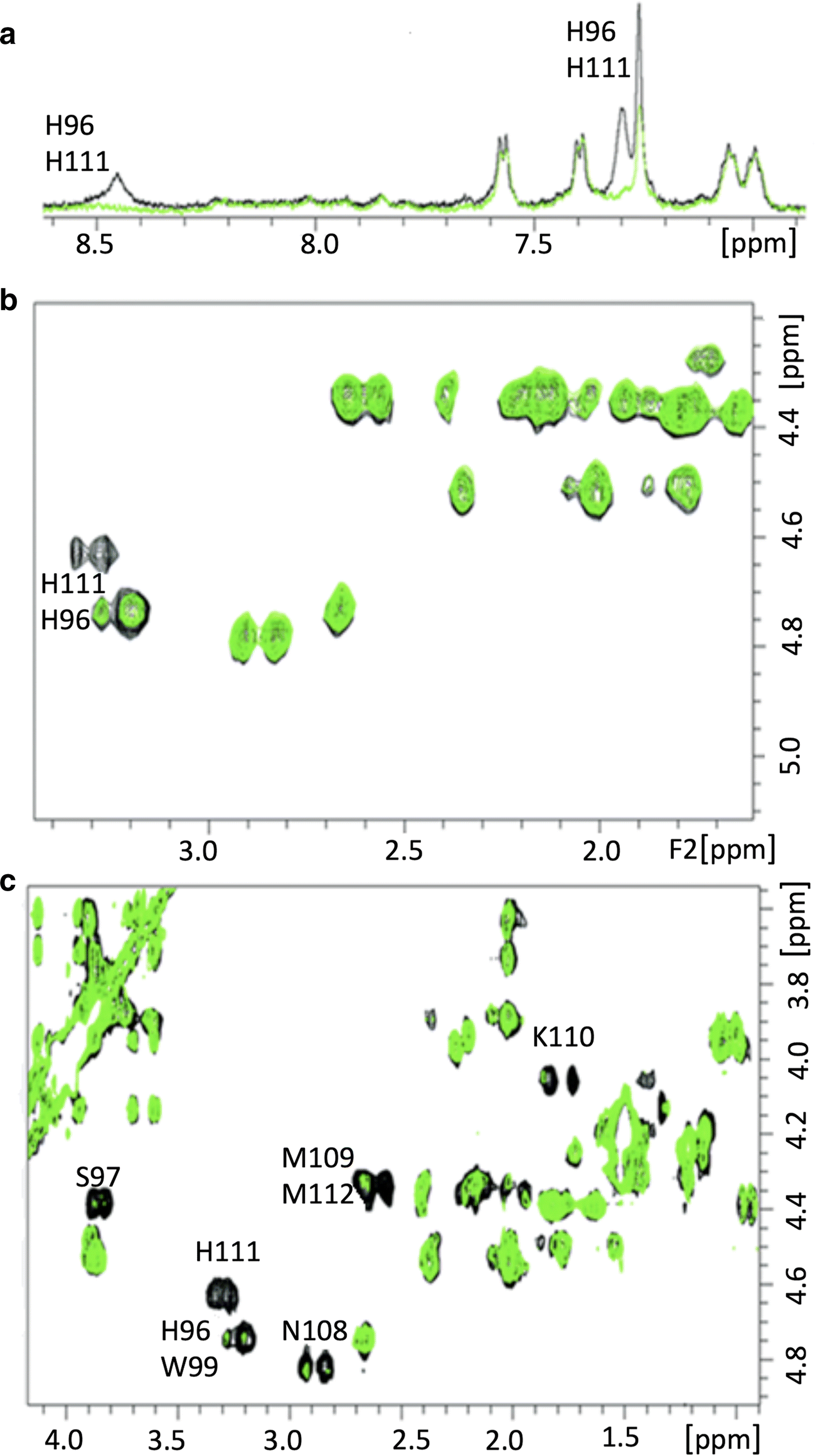 224]. In general, 2D NMR can be used to overcome the problem of overlapping resonances by dispersing the overlapping chemical shift in a second dimension. The additional resolution offers a practical solution to detecting and identifying specific sites within macromolecule, as in the case of Cu (II) ions [