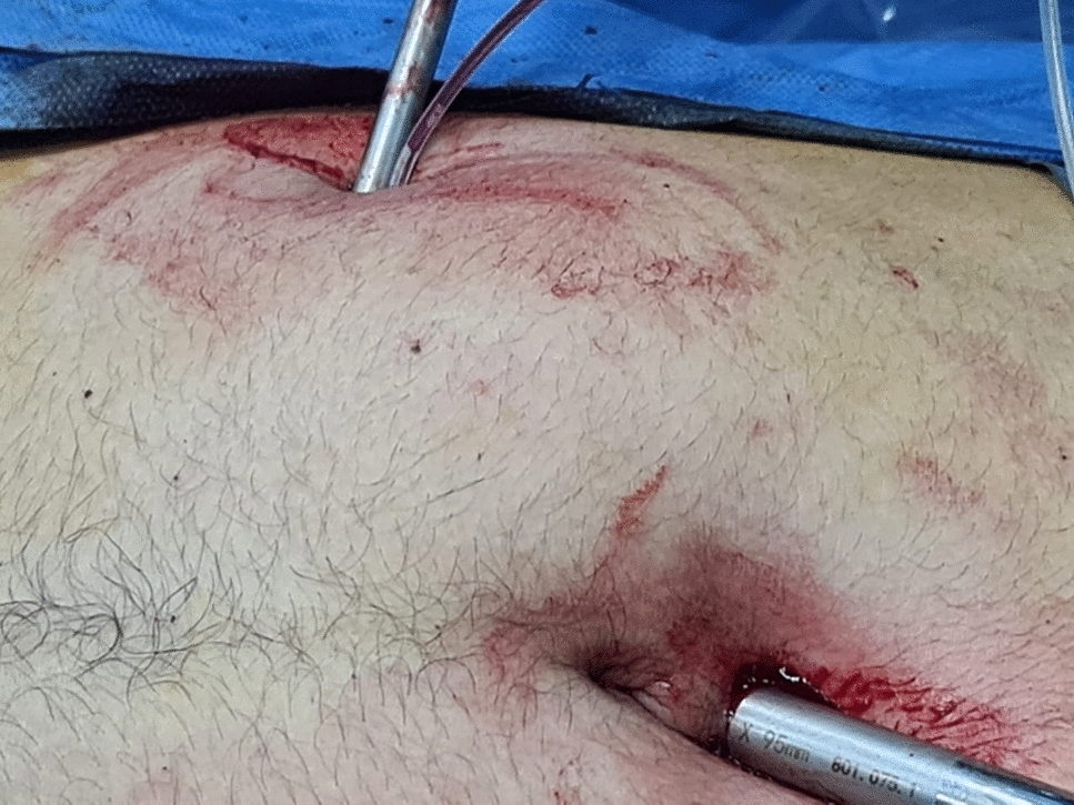 Alongside the 5-mm suprapubic trocar, the same skin incision was used to introduce the endoscopic snare