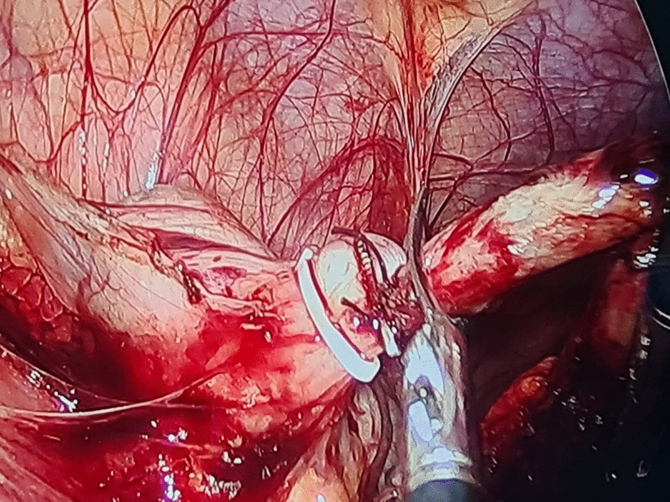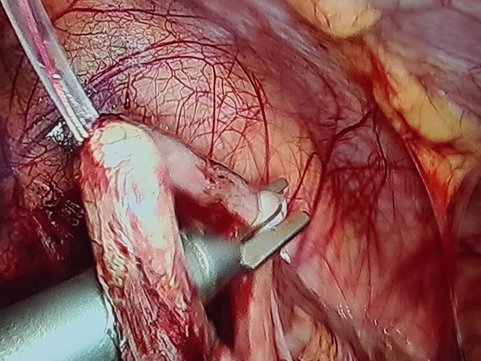 A thorough diagnostic laparoscopy was started with routinely in all cases to confirm the diagnosis of acute appendicitis and to exclude other possible cause of the illness. Alongside the 5-mm trocar, the same skin incision was used to introduce the endoscopic snare (Fig. 2). With the aid of the endoscopic snare, the appendix was readily and successfully manipulated, just like an endo-grasper (Fig. 3). A LigaSure or a Harmonic vessel-sealing device was used to cut and safely separate the meso-appendix, according to the availability and the surgeon preference. A 5-mm endoscopic titanium or polymer endo-clips, according to the situation and availability, were used to ligate the appendix near its base by applying 2 staples on the base and one staple on the stump (Fig. 4), and appendectomy was completed. The surgical specimen was extruded retrogradely under vision through the 10-mm port while withdrawing the telescope. The fascia was closed with 2/0 vicryl and the skin was closed with 4/0 sub-cutaneous vicryl sutures. All specimens were sent postoperatively for histopathological examination.