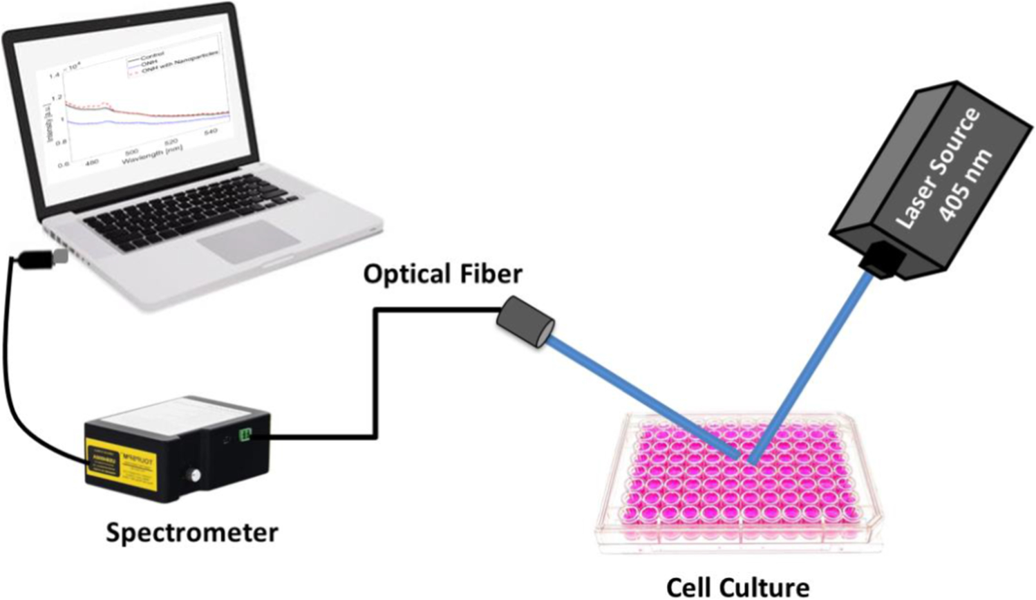 The optical setup for acquiring the fluorescence characteristics of normal and cancer cells is presented in Fig. 1. A continuous-wave diode pumped solid-state (DPSS) laser source (XL-R405SD, Xinland International Co., Ltd, China) at wavelength of 405 nm and output power of 100 mW has been used as the excitation source. The laser beam diameter is about 2 mm. Upon interacting with the tested oil samples, the resultant fluorescence emission has been delivered to a digital spectrometer (STDFSM, Touptek Photonics Co. Ltd, Zhejiang, China) via an optical fiber. The spectrometer is connected to a computer through a USB cable.