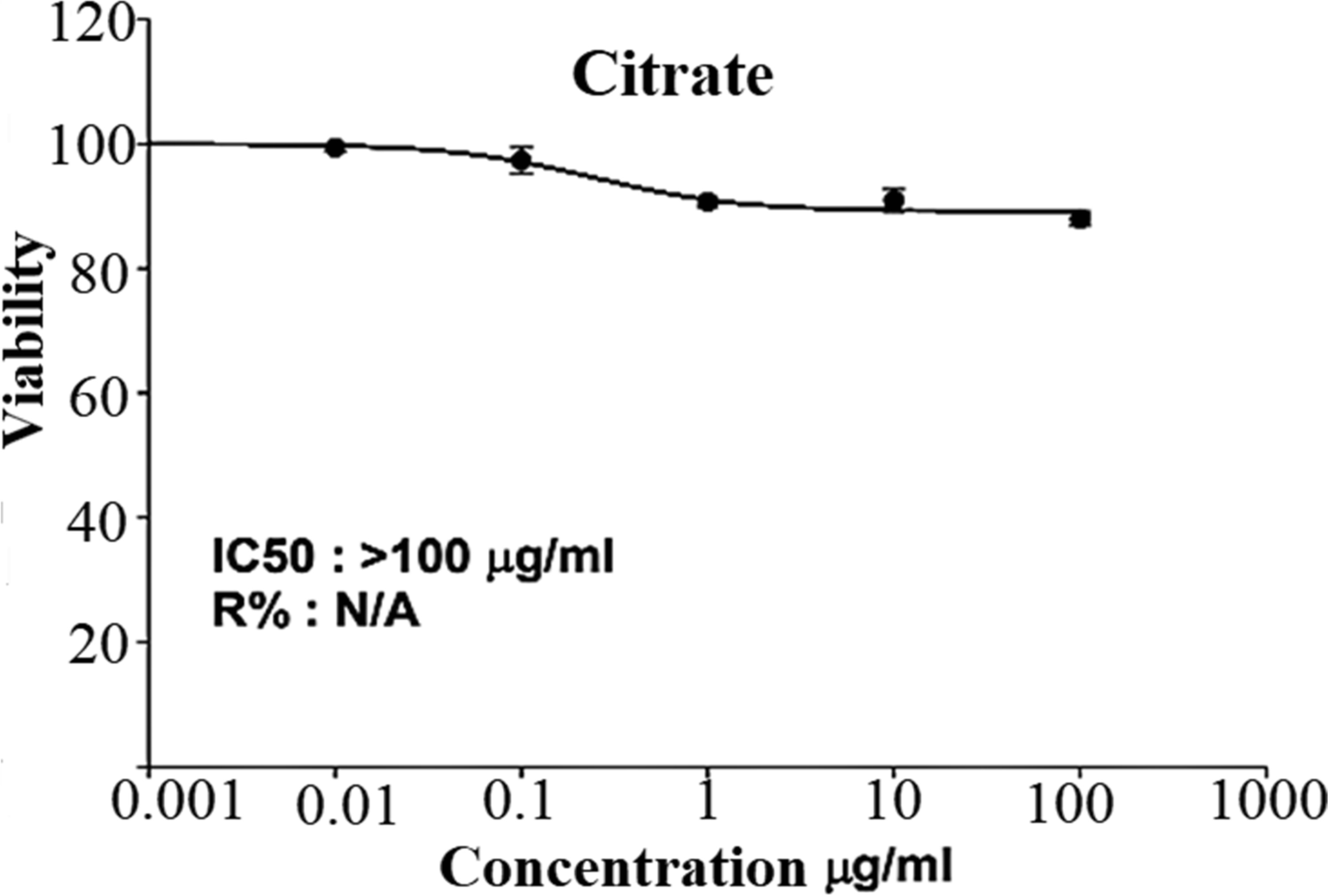 Cytotoxicity test at different concentrations (µg/ml) of AuNPs on oral epithelial cell line after incubation for 72 h