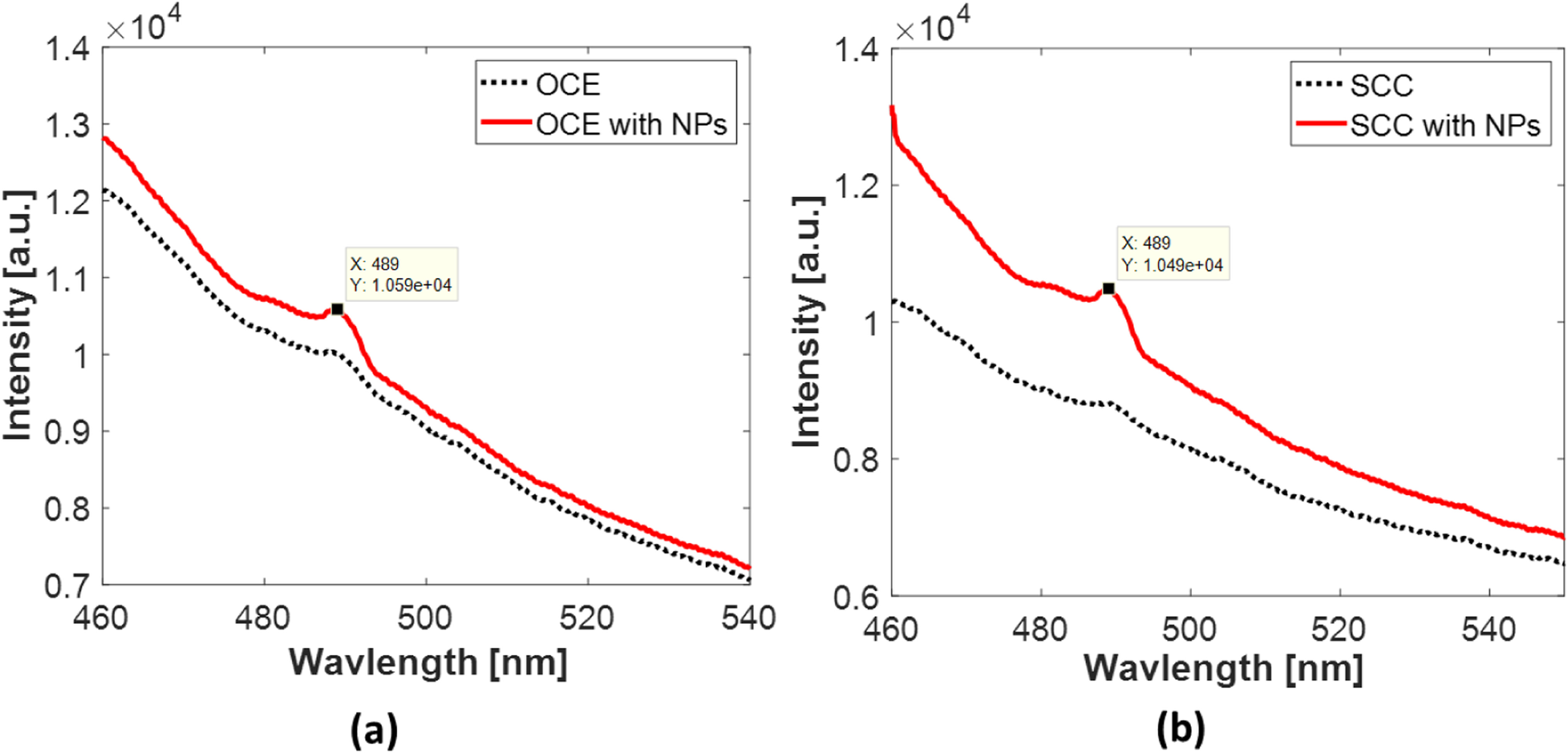 Upon exciting the examined samples by the 405-nm incident laser irradiation, a fluorescence peak was observed at 489 nm in the OCE and SCC mixed with AuNPs as presented in Fig. 6. However, this peak is relatively higher in the SCC mixed with AuNPs compared with those without adding the NPs.