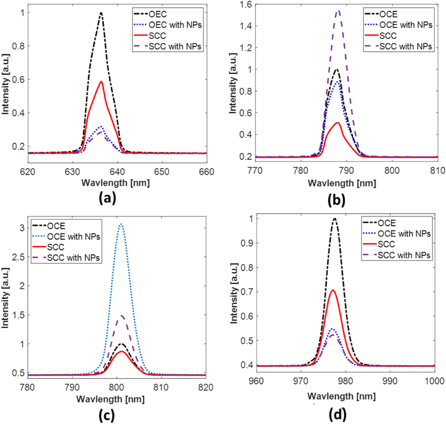 Figure 7a shows low reflection in squamous cell carcinoma with AuNPs and also in normal epithelial cells with AuNPs; on the other hand, it shows high reflection in squamous cell carcinoma and normal epithelial cells without AuNPs at 635 nm. Almost similar results were obtained at the 980-nm laser irradiation (Fig. 7d). Moreover, Fig. 7b shows a high reflection in squamous cell carcinoma with AuNPs and also moderate reflection in normal epithelial cells with and without AuNPs in addition to low reflection in squamous cell carcinoma without AuNPs at 785 nm. At 808 nm, the highest reflectance was obtained in the OCE with NPs, while the SCC showed the lowest one. Additionally, moderate reflectance in SCC with NPs was observed (see Fig. 7c).