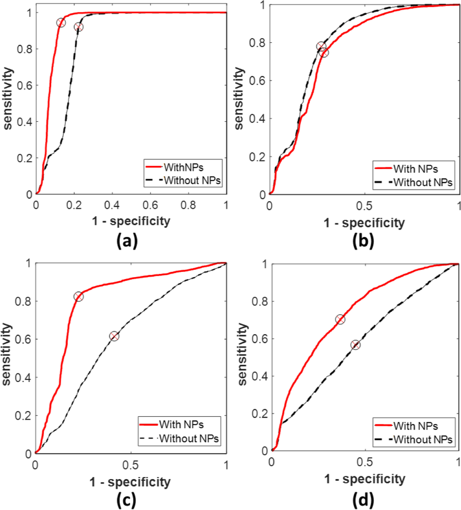 ROC curves of the studied cell lines before and after adding NPs: (a) at 660 nm, (b) at 785 nm, (c) at 808 nm, (d) at 980 nm