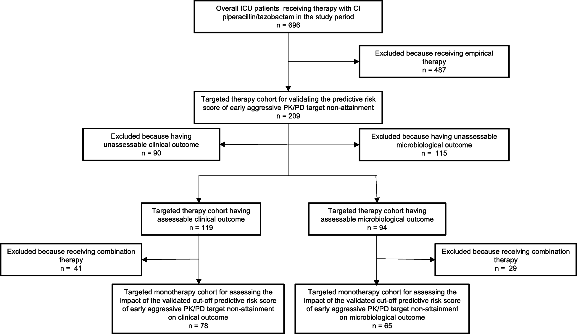 In the overall study period, a total of 696 and of 364 critically ill patients were treated with CI piperacillin-tazobactam (Fig. 1) or meropenem (Fig. 2), respectively. After excluding patients receiving empirical treatment (487 and 161, respectively), 209 and 203 patients receiving CI piperacillin-tazobactam or meropenem-targeted therapy, respectively, were included in each validation cohort. Among these, after excluding those not having assessable outcomes and/or receiving combination therapy, the sub-cohorts of patients for assessing the impact of the cut-off risk score on clinical and microbiological outcome were composed by 65 and 78 patients in the piperacillin-tazobactam group, respectively, and by 83 and 90 patients in the meropenem group, respectively.