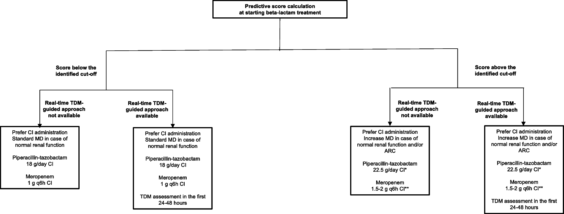 Several clinical studies showed that early aggressive PK/PD target attainment may be quite challenging whenever using standard doses of beta-lactams among critically ill patients. The proportions of non-attainment reported in different studies were as high as 40% to 60% [10‐12]. Delivering dosage by extended infusion (EI) or by continuous infusion (CI) and providing dosing adaptation based on real-time therapeutic drug monitoring (TDM) were shown to be valuable approaches for increasing the likelihood of early aggressive PK/PD target attainment with both meropenem and piperacillin-tazobactam in this scenario [13, 14]. At our center, for several years, we started applying either CI administration or real-time-TDM dosing adaptations with the intent of optimizing early aggressive PK/PD target attainment of beta-lactams [13]. Unfortunately, whereas administering beta-lactams by CI may be easily implementable in every ICU, implementing a real-time TDM-guided strategy for optimizing beta-lactam exposure, although currently recommended [15], is not yet widely applied in the ICU setting [16]. Consequently, establishing a priori the reliability of a risk score in predicting early aggressive beta-lactam PK/PD target non-attainment would be extremely helpful among critically ill patients treated with standard CI beta‑lactams.