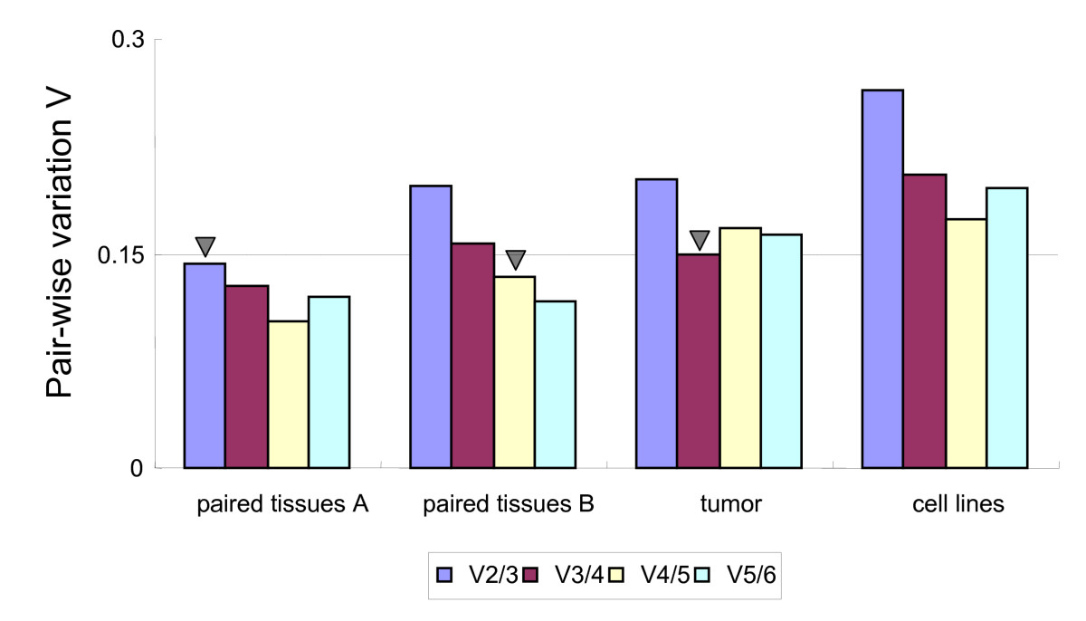 Determination of the optimal number of reference genes for paired tumoral and non-tumoral tissues, tumor tissues and cell lines separately. Pair-wise variations (Vn/n+1) between every combination of sequential normalization factors were calculated to determine the minimum number of reference genes required for accurate normalization in different sample panels (Paired tissues A: paired tumoral and non-tumoral tissues left after the exclusion of RNA samples with relatively high amount of inhibitors; Paired tissues B: all paired tissues). The cutoff value below which the inclusion of an additional reference gene does not result in a significant improvement of normalization, was set at 0.15 (arrowhead = minimum number of reference genes for normalization).
