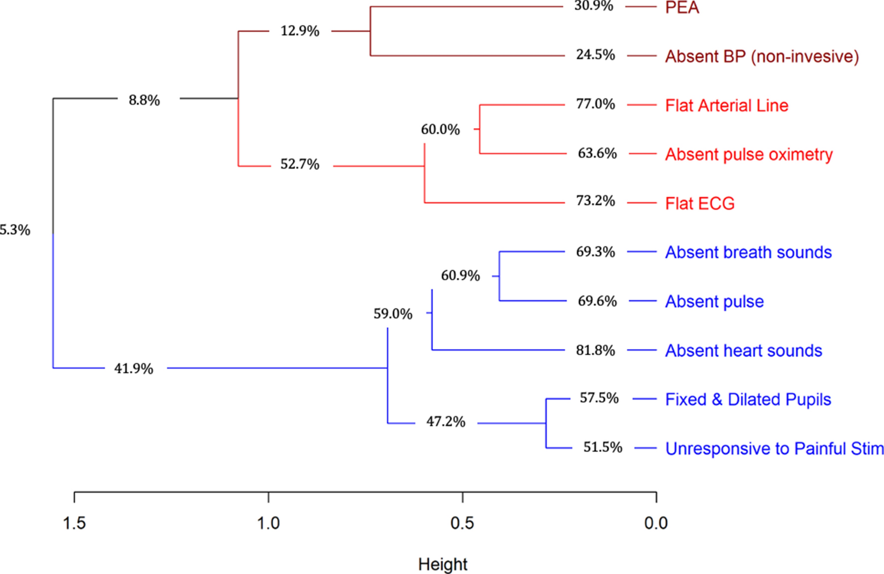 A hierarchical clustering analysis was conducted to determine which different diagnostic tests tended to be used together. Clinical signs such as absent heart sounds by auscultation, absent breath sounds by auscultation, and absent pulse by palpation were used together in 59% of the cases (Figure). Similarly, monitoring indicators, such as a flat arterial line, absent pulse oximetry, and flat ECG tracing, were used together in 53% of the cases. Neurologic indicators such as fixed and dilated pupils and unresponsiveness to painful stimulus were used together in 47% of cases and combined with clinical signs in 42% of cases.