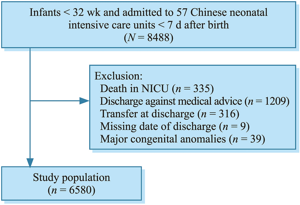 In the 57 participating hospitals, 8488 VPIs were admitted to NICUs within 7 days after birth in 2019. Of these infants, there were 1908 infants excluded in this study because of deaths, discharge against medical advice, transfers, major congenital anomalies, and missing date of discharge. The remaining 6580 VPIs that survived to discharge were included in the final analysis (Fig. 1).
