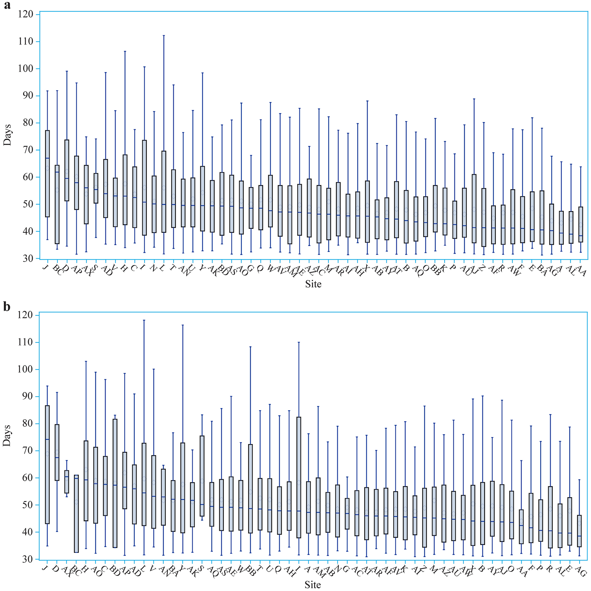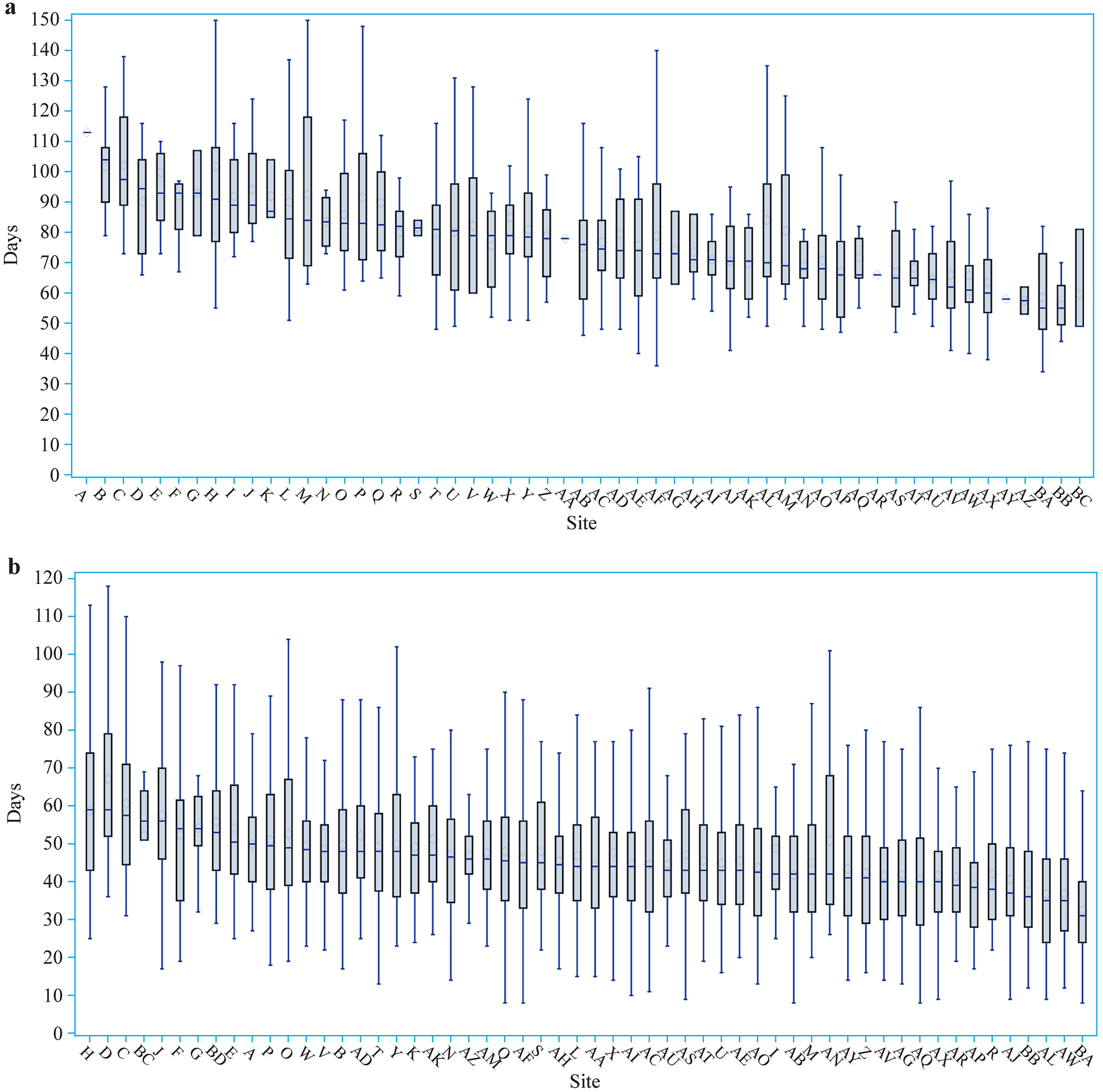 Distribution of LOS for very preterm infants across Chinese Neonatal Network sites. a Distribution of LOS for infants less than 28 weeks’ gestation; b distribution of LOS for infants at 28–31 weeks’ gestation. LOS length of stay