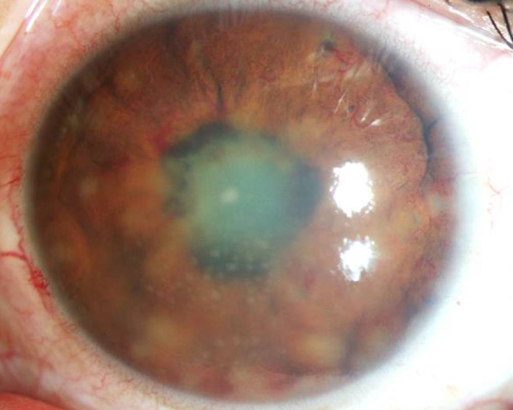 Vorderabschnittsfoto bei okulärer Tuberkuloseinfektion mit granulomatösen Endothelbeschlägen, multiplen Irisgranulomen sowie Rubeosis iridis verbunden mit einem Augeninnendruckanstieg und einer Cataracta complicata