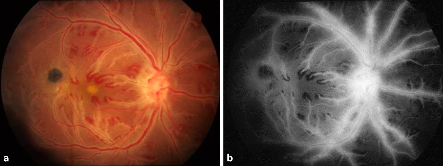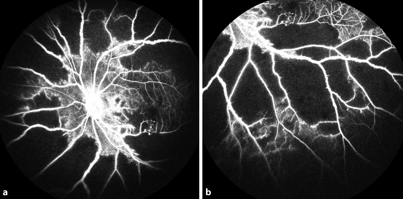 Fluoreszenzangiographie einer okklusiven Vaskulitis bei systemischem Lupus erythematodes. Ausgeprägte Ischämie im Bereich der zentralen (a) und peripheren Retina (b)