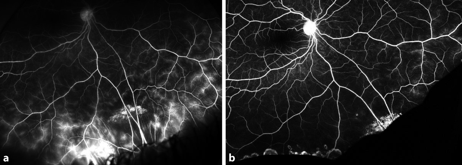 Fluoreszenzangiographie zur Darstellung des Entzündungsrückgangs nach Laserkoagulation ischämischer Netzhautareale bei retinaler Vaskulitis. a Angiographie unter systemischer Therapie mit Methotrexat und Adalimumab. b Angiographie unter systemischer Therapie mit Methotrexat und Adalimumab nach retinaler Laserkoagulation
