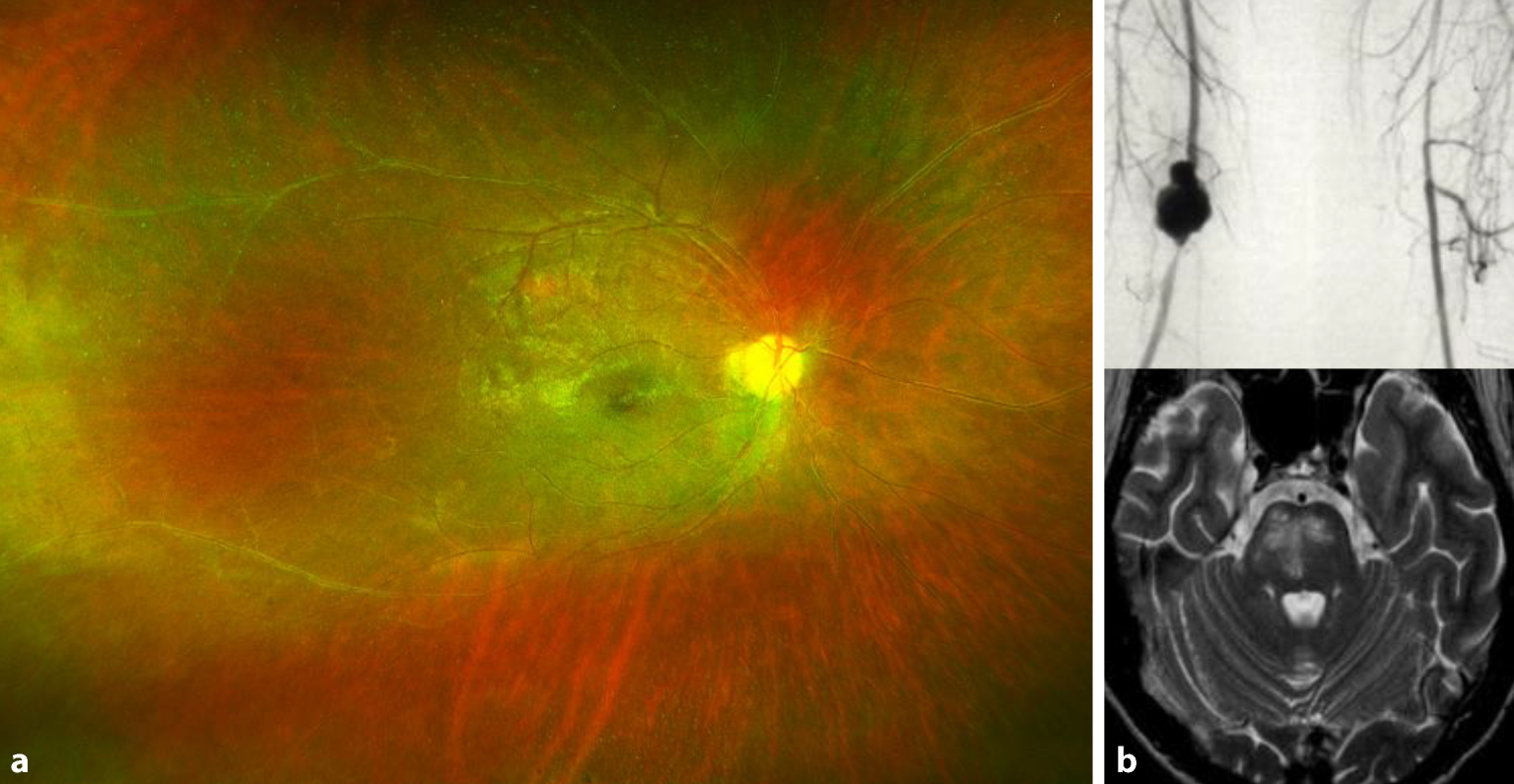 a Fundusbild einer okklusiven Vaskulitis bei Morbus Behçet mit beginnender Optikusneuropathie. b Darstellung eines Aneurysmas der A. poplitea in der digitalen Subtraktionsangiographie (oben) und Magnetresonanztomographie (MRT) eines Patienten mit Neuro-Behçet mit Manifestation der parenchymatösen Entzündung (T2-hyperintense Läsionen) im Hirnstamm (unten)