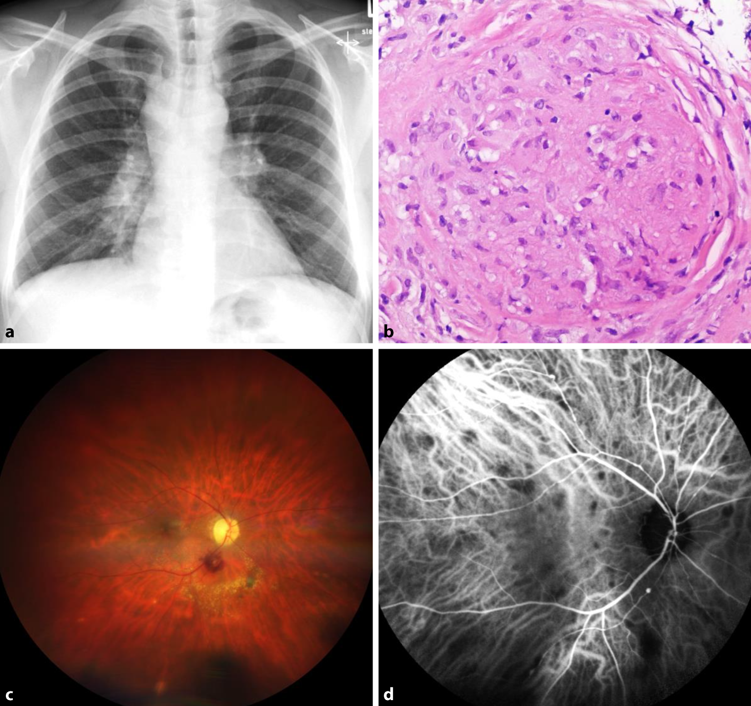 Veränderungen bei Sarkoidose. a Röntgenaufnahme des Thorax bei bihilärer Lymphadenopathie. b Sarkoidosegranulom mit Schaumann-Körperchen aus dem Lymphknoten in HE(Hämatoxylin-Eosin)-Färbung. c Fundusfotografie bei okulärer Sarkoidose mit Aneurysma am unteren Gefäßbogen und choroidalen Granulomen. d Indocyaningrünangiographie mit hypofluoreszenten Läsionen in der Frühphase/mittleren Phase durch Minderperfusion der Choriokapillaris in Bereichen kleiner choroidaler Granulome