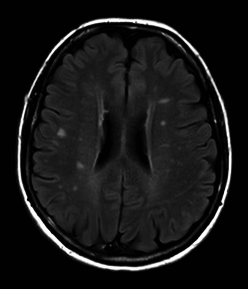 Zerebrale Magnetresonanztomographie (MRT) (T2W FLAIR) mit multiplen hyperintensen Läsionen bei multipler Sklerose