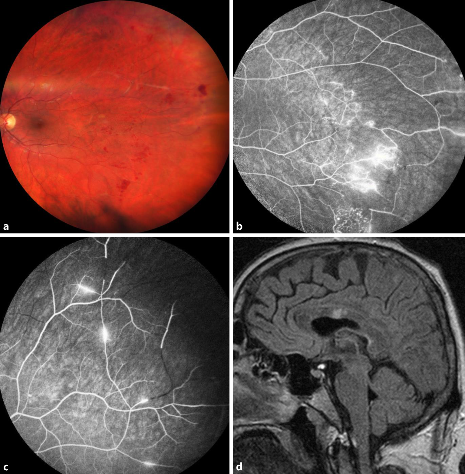 Veränderungen bei Susac-Syndrom. a Fundusbild mit Gefäßeinscheidungen und peripheren retinalen Hämorrhagien. b, c Fluoreszenzangiographie mit peripheren Gefäßokklusionen und segmentaler Vaskulitis. d T2-MRT (Magnetresonanztomographie) mit hyperintenser Läsion im Bereich des Corpus callosum