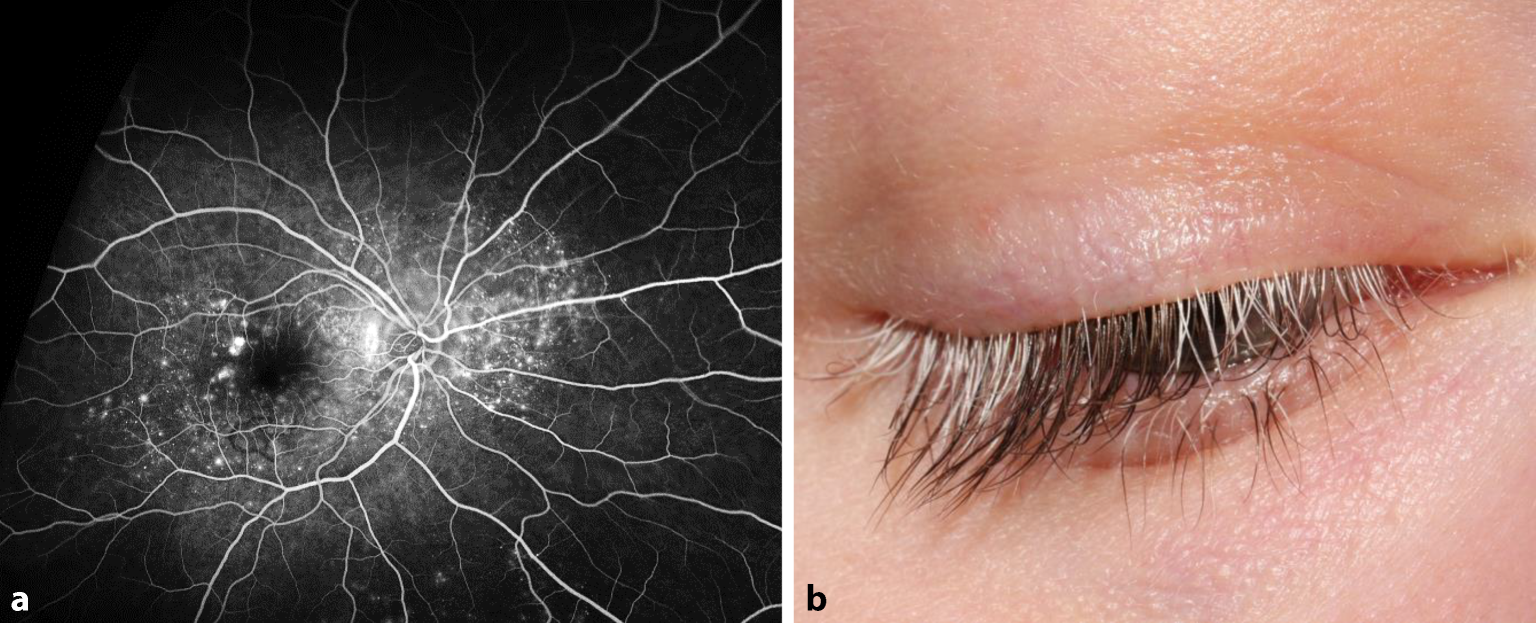 Veränderungen bei Vogt-Koyanagi-Harada-Syndrom. a Fluoreszenzangiographie mit hyperfluoreszenten Pinpoint-Läsionen. b Poliosis – Depigmentierung der Zilien