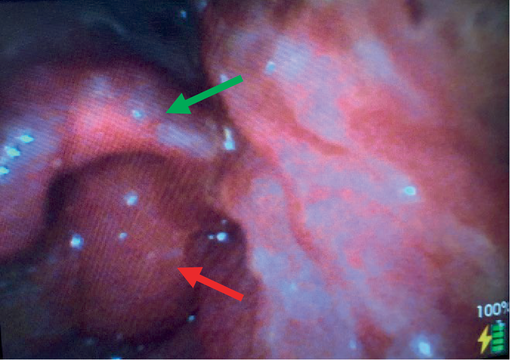 Videolaryngoskopische Sicht (Aryknorpel [roter Pfeil] und Epiglottis [grüner Pfeil])