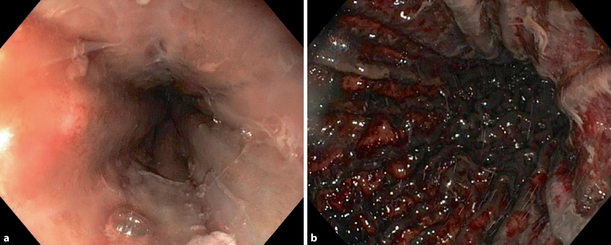 Bei der im kurzfristigen Verlauf progredienten Lippenschwellung und den massiven Schmerzen der Patientin fiel die Entscheidung zur Narkoseeinleitung und Intubation in Koniotomiebereitschaft. Neben enoralen Schleimhautverletzungen zeigte sich in der Videolaryngoskopie eine deutliche Schwellung von Epiglottis und Aryknorpeln (Abb. 1). Die endotracheale Intubation gelang schließlich mit einem kleinlumigen Endotrachealtubus (ET, Innendurchmesser [ID] 6,0 mm). Hierüber war eine suffiziente Beatmung möglich, es bestand klinisch kein Hinweis auf eine Aspiration. Die Kreislaufsituation ließ sich durch Volumengabe und niedrig dosierte Katecholamintherapie stabilisieren. Unmittelbar nach Atemwegssicherung wurde im Schockraum eine Gastroskopie durchgeführt. Diese ergab ausgedehnte Schleimhautablösungen und nekrotische Areale der Schleimhaut von Ösophagus und Magen, welche bis in das Duodenum reichten (Grad 2b bis 3b nach Zargar [1], Abb. 2). Die sich im Bereich des Magenkorpus und -fundus befindliche Flüssigkeit, bei welcher es sich mutmaßlich noch um Reste des in Wasser aufgelösten Abflussreinigergranulats handelte, wurde vollständig abgesaugt. In der anschließend durchgeführten Computertomographie (CT) des Thorax und Abdomens kamen ausgeprägte ödematöse Veränderungen im Bereich von Pharynx und Larynx sowie der Wand von Ösophagus und Magen zur Darstellung. Eine Hohlorganperforation oder eine aktive Blutung konnte ausgeschlossen werden. Bei mäßigen pneumonischen Infiltraten beider Unterlappen bestand der Verdacht einer Aspirationspneumonie, ein Lungenödem bestand nicht.