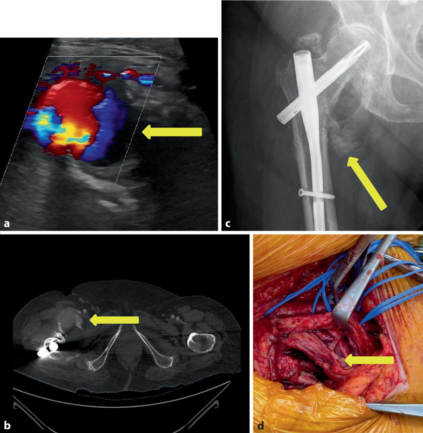6], sollte aber bei schwierigen Untersuchungsbedingungen den „work flow“ nicht aufhalten. Zur primären Sicherung einer Fraktur kommt in erster Linie eine Nativröntgenaufnahme zur Anwendung. Bei klinischem Verdacht eines Pseudoaneurysmas sollte sich eine leicht durchführbare Sonographie und farbcodierte Duplexsonographie anschließen, die einen schnellen Überblick über eine pulsierende Raumforderung im Frakturbereich ergibt. Die Kombination einer CTA und DSA erlaubt eine genaue Beurteilung der Ausdehnung eines Pseudoaneurysmas, der umgebenden oder verdrängten Strukturen, eine genaue Lokalisation der Perforationsstelle bzw. exakte Einstufung der Art der Läsion der betroffenen Arterie (und möglicherweise auch assoziierten Vene[nstruktur]) sowie eine Beurteilung der Fraktur und Frakturenden zur Planung einer Rekonstruktion. Das Erkennen von Pseudoaneurysmen nach Schenkelhalsfrakturen und deren Versorgung ist durch regelhafte postoperative Kontrolluntersuchungen schwer möglich, da meist nur Nativröntgenaufnahmen zur Stellungskontrolle der Implantate und Frakturenden durchgeführt werden. In 2 Fallberichten mit Literaturreview der letzten Jahre wurde auf ein Scalloping-Zeichen an der medialen Kortexseite des Oberschenkelknochens als Wirkung des Druckes und der Turbulenzen des Aneurysmas in späteren Phasen der Nativröntgenverlaufskontrolle hingewiesen [