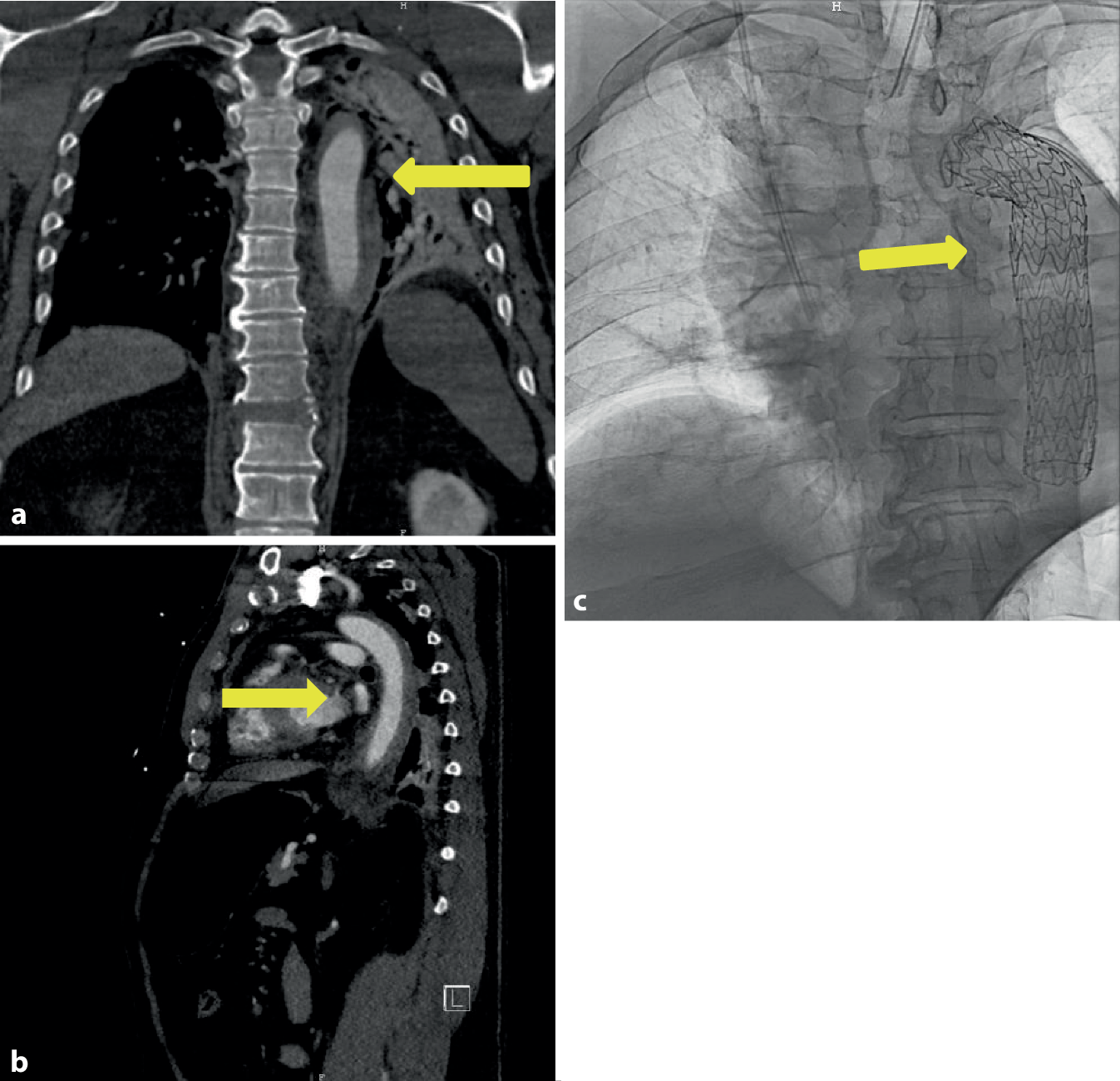 Die Schnitt-Naht-Zeit betrug im Durchschnitt 60,65 (Streubreite: 23–121, Median: 50) min. In 4 Fällen entschied sich der Operateur, die linke A. subclavia zu überstenten. Dies erfolgte 3‑mal bei Verletzungen in Zone 3 nach Ishimaru und 1‑mal in Zone 2 nach Ishimaru. Dies führte bei den Patienten zu keiner unmittelbaren Beeinträchtigung der arteriellen Gefäßversorgung der linken Hand. Bei einem Patienten erfolgte nach 12 Monaten aufgrund beeinträchtigender Belastungsbeschwerden die Anlage eines karotidosubklavialen Bypasses. 3 Patienten verstarben an den Folgen des Polytraumas, bei einem Patienten davon konnte ein axonaler Marklagerschaden und ein intraspinales Hämatom durch das Polytrauma im MRT nachgewiesen werden. Die restlichen 9 Patienten wiesen keine Zeichen einer Paraplegie oder Paraparese durch die Aortenstentung auf. Von den 12 Patienten war ein Patient bereits mit einer aortobiiliacalen Stentprothese bei Aortenaneurysma voroperiert worden. Bei diesem Patienten erfolgte nach 10 Monaten eine distale Stentverlängerung bei distalem Typ-I-Endoleak. In allen Fällen erfolgte die Versorgung mit Gore TAG Conformable® (W. L. Gore & Associates, Inc.), wobei am häufigsten eine Prothese mit einem Durchmesser von 26 mm und einer Länge von 10 cm benutzt wurde. Zusammenfassend wird trotz der statistisch geringen Patientenanzahl in der eigenen Patientenkohorte anhand der Ergebnisse der Nutzen der TEVAR bei traumatischen Aortenrupturen gerade bei schwer polytraumatisierten Patienten durch geringe Operationszeiten, die sicherlich auch von der Erfahrung des Operateurs abhängig sind, und dem geringen Zugangstrauma sichtbar.