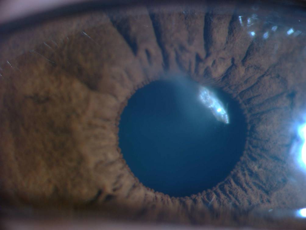 Vorderabschnittsfotografie des intralentalen Fremdkörpers. Anterior davon ist die gedeckte Hornhautpenetration zentral zu erkennen