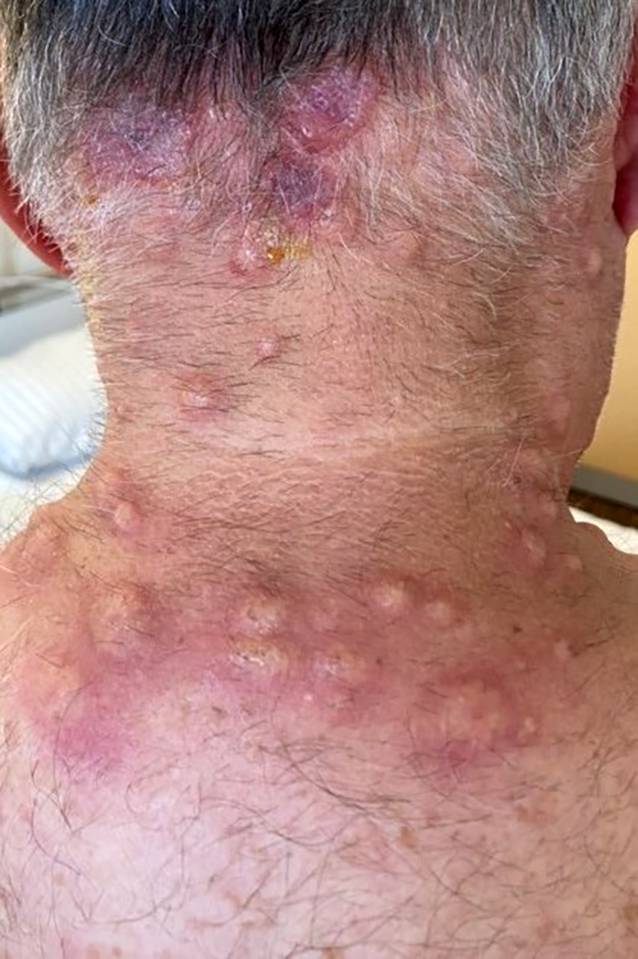 74-jähriger Patient mit ausgeprägter steroidrefraktärer neutrophiler Dermatitis bei UBA1-Mutation, der initial als Sweet-Syndrom behandelt wurde