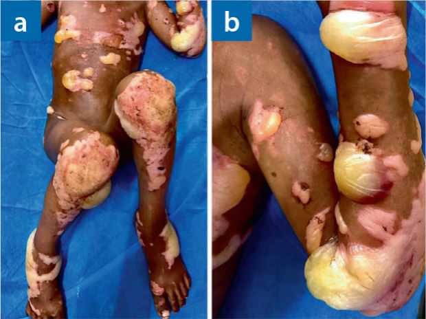 Bei einem neunjährigen indischen Jungen bestanden seit zwei Tagen stark juckende, schmerzhafte, flüssigkeitsgefüllte Blasen und Erytheme an Rumpf und Extremitäten, die rund 13 % der gesamten Körperoberfläche bedeckten. Nägel, Genitalien oder Mundhöhle waren nicht betroffen. Die Blasen ähnelten thermischen Verbrennungen, allerdings war die Haut um die Blasen depigmentiert. Das Kind litt seit fünf Jahren an stabiler generalisierter nicht segmentaler Vitiligo.