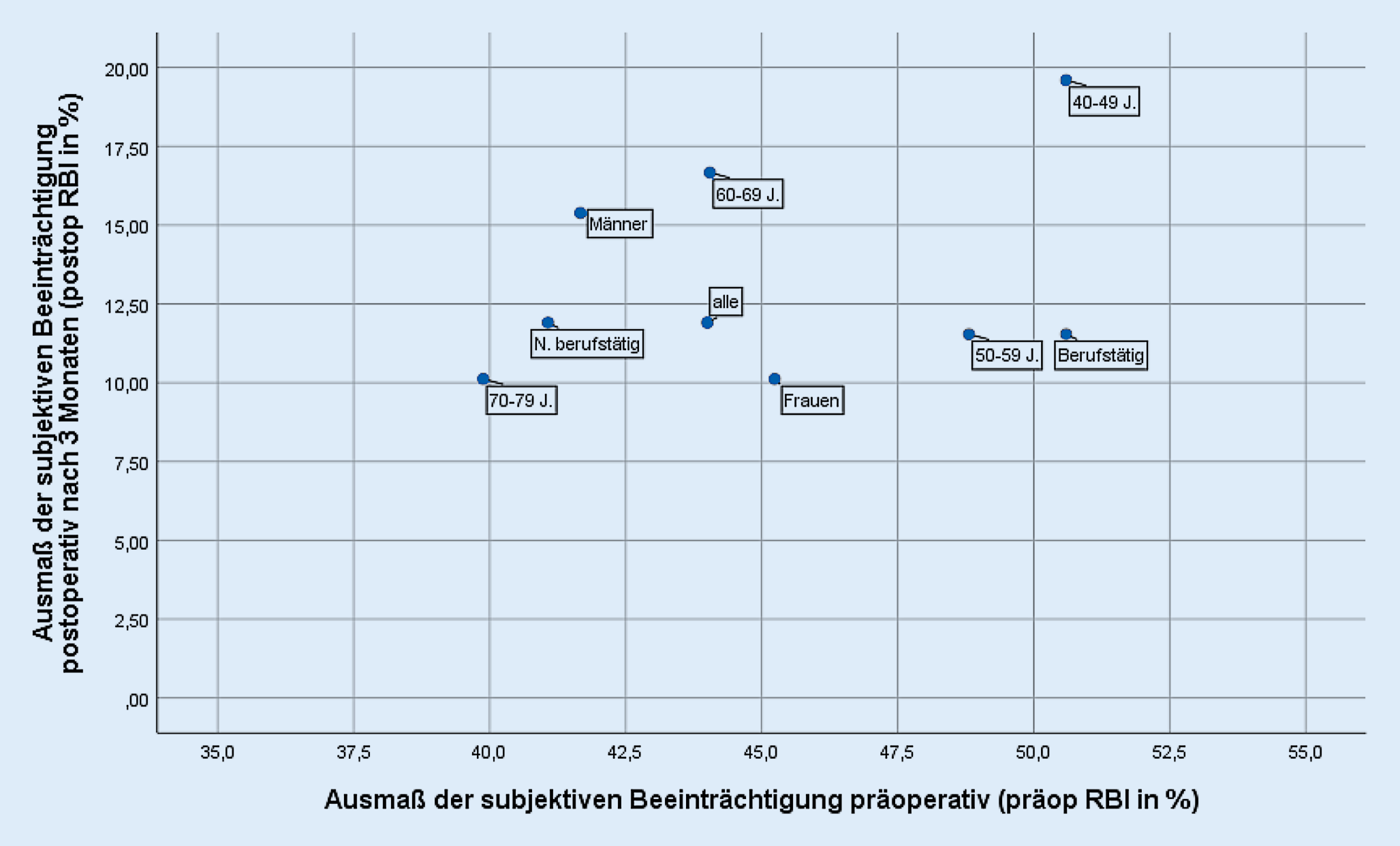 Mit der Auswertung konnten zwar zahlreiche Trends herausgearbeitet und z. T. mit lokaler Signifikanz in der univariaten Analyse unterlegt werden, insgesamt sind die Ergebnisse aber wenig belastbar. Insbesondere die multivariate lineare Regression lässt keine statistisch signifikanten Beziehungen zwischen den geprüften Merkmalen und dem präop RBI erkennen. Eine Ursache dürfte die geringe Fallzahl sein. Denkbar ist aber auch, dass die Abhängigkeiten zwischen Merkmalen und subjektivem Beeinträchtigungsgefühl tatsächlich eher schwach sind. Eine Überprüfung im Rahmen einer fallzahlstärkeren Untersuchung oder einer Metaanalyse wäre wünschenswert.