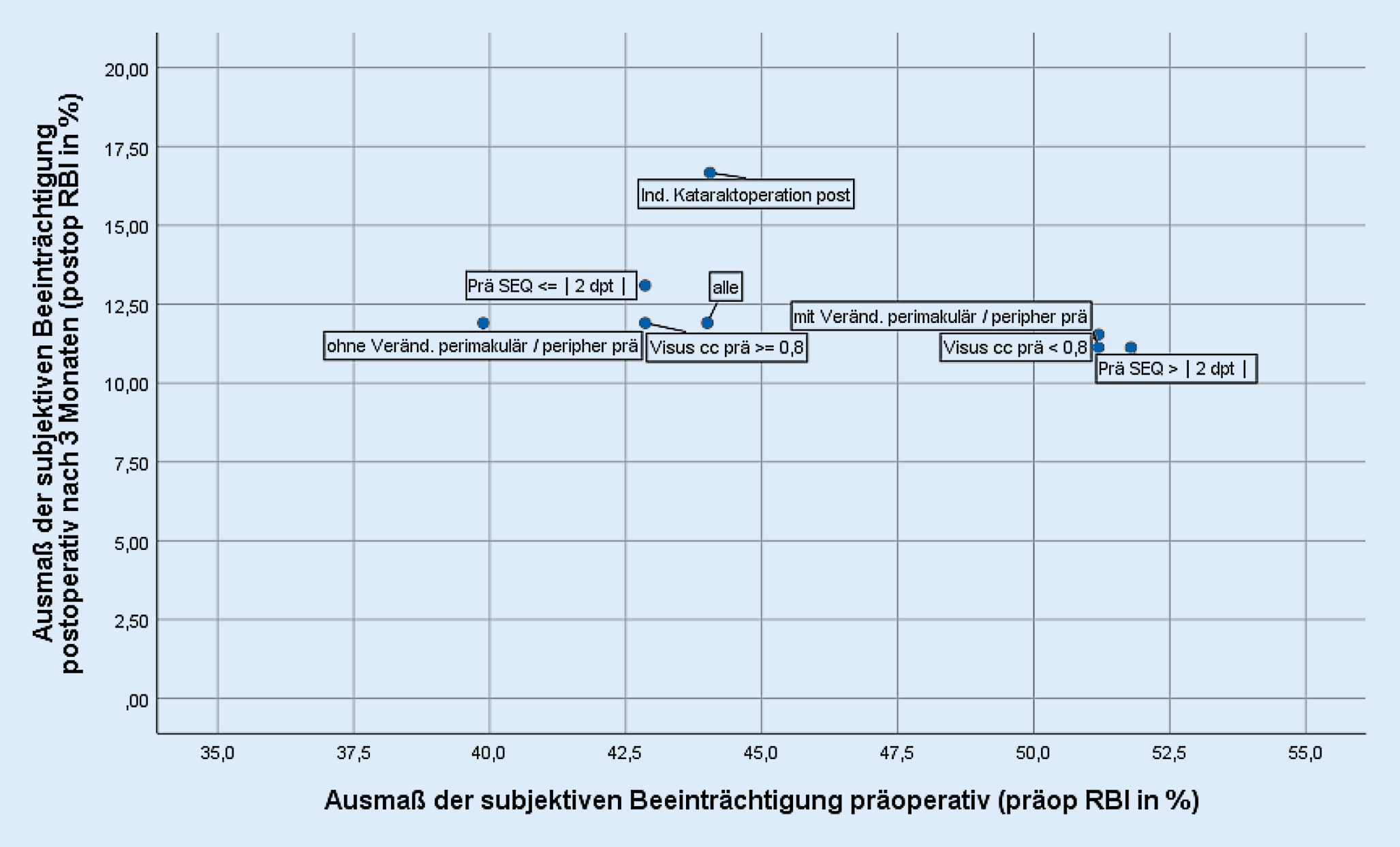 Die Mediane der präoperativen RBI gesamt (im Folgenden „präop RBI“) sowie postoperativen RBI gesamt (im Folgenden „postop RBI“) wurden für die zu prüfenden Merkmale univariat stratifiziert in 3 Abbildungen (soziodemografische Merkmale, ophthalmologische Merkmale, klinische Bewertung von Floatern auf dem Studienauge und am zweiten Auge) als Streudiagramme abgetragen. In der Abszisse (x-Achse) ist der präop RBI abgetragen; je höher der Wert, umso ausgeprägter erlebte der Studienpatient die präoperative Beeinträchtigung. In der Ordinate (y-Achse) ist der postop RBI nach 3 Monaten abgetragen; je niedriger dieser Wert, umso geringer war die subjektive postoperative Beeinträchtigung. Der gleichzeitige Abtrag des präop und postop RBI visualisiert sowohl die präoperative als auch die postoperative subjektive Beeinträchtigung und erlaubt damit einen Rückschluss auf den Nutzen der Vitrektomie: So stehen ein hoher präop und ein niedriger postop RBI (unterer rechter Quadrant) für einen hohen Rückgang einer ursprünglich hohen subjektiven Beeinträchtigung und repräsentieren damit einen hohen Gewinn aus der Vitrektomie. Hingegen lässt ein präop und postop niedriger RBI (unterer linker Quadrant) einen vergleichsweise geringen Rückgang der subjektiven Beeinträchtigung erkennen.