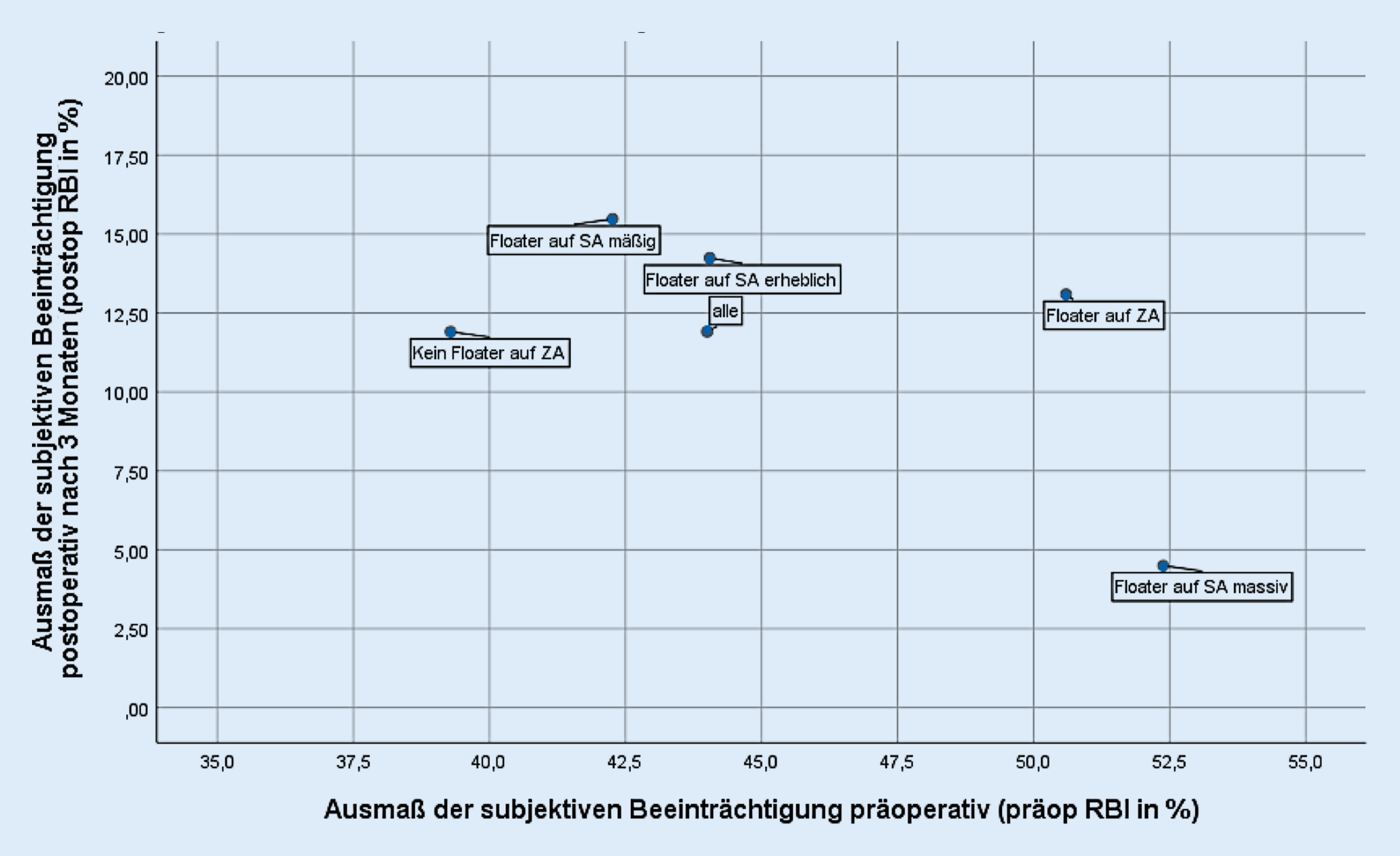 Je höher der präop RBI, umso höher der realisierte Rückgang der Beeinträchtigung und damit der Nutzen des operativen Eingriffs, der präop RBI kann damit als eine eigenständige prädiktive Größe herangezogen werden. Zu überlegen ist, zur Evaluation der subjektiven Beeinträchtigung im klinischen Alltag auf einen Floaterfragebogen zurückzugreifen. Soweit der für diese Studie entwickelte Fragebogen zur Anwendung kommt, können die in der Praxis erhobenen individuellen Daten mit denen in der Primärveröffentlichung und denen in dieser Auswertung publizierten im Sinne einer Einstufung des Schweregrades der subjektiven Beeinträchtigung abgeglichen werden.