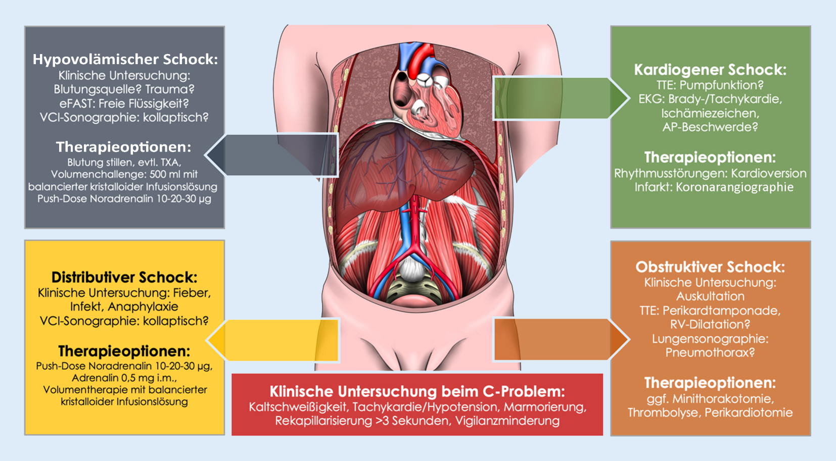 Im Rahmen des nichttraumatologischen Schockraummanagements zur Versorgung kritisch kranker Patienten werden akute Störungen der Vitalfunktionen rasch detektiert und behandelt. Beim „primary survey“ (Erstversorgung) dient das etablierte ABCDE-Schema der strukturierten Untersuchung aller relevanten Vitalparameter. Akute Störungen werden hierbei unmittelbar detektiert und therapiert. „C-Probleme“ stellen den größten Anteil der ABCDE-Störungen bei nichttraumatologischen Schockraumpatienten dar und zeichnen sich durch eine hämodynamische Instabilität infolge hypovolämischer, obstruktiver, distributiver oder kardiogener Schockformen aus. Abhängig von den lokalen Versorgungsstrukturen umfasst die nichttraumatologische Schockraumversorgung hierbei auch die Stabilisierung von Patienten mit akutem Koronarsyndrom oder nach prähospitaler Reanimation (Cardiac Arrest Center).