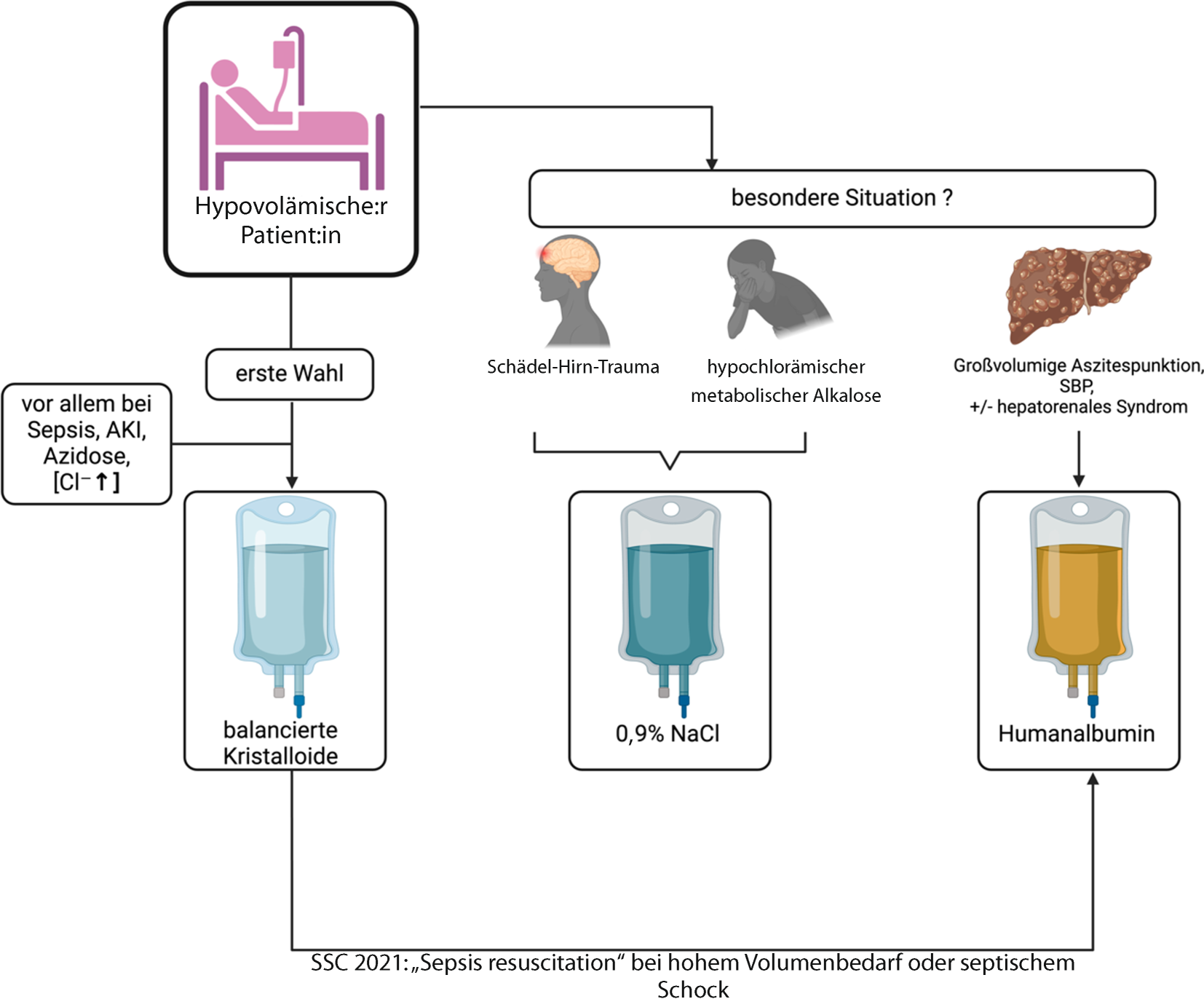 Sepsis, einer häufigen Entität, bei der die Flüssigkeitstherapie eine wichtige Rolle spielt, empfehlen die aktuellen Surviving-Sepsis-Campaign(SSC)-Leitlinien als primäre Resuscitation-Flüssigkeit BK (Abb.