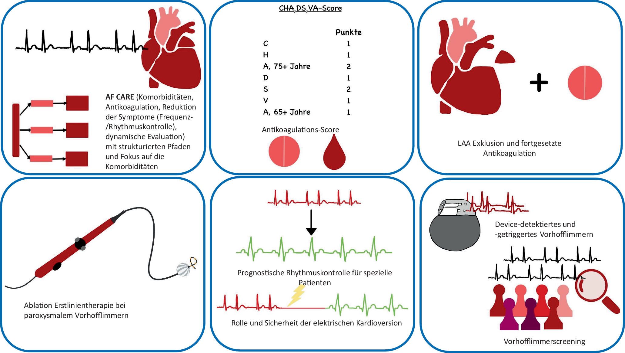 Die 2024 veröffentlichten Leitlinien der ESC zum Management von Vorhofflimmern geben aktuelle, evidenzbasierte Empfehlungen für eine umfassende Behandlung von Vorhofflimmerpatienten. Diese wird durch das AF-CARE-Konzept vorgegeben, das Komorbiditäten und Risikofaktoren in den Vordergrund stellt. Es soll Symptomlast, Rezidivhäufigkeit, Lebensqualität und Prognose verbessern. Eine Antikoagulation, vorzugsweise mit einem DOAK, wird bei Patienten mit erhöhtem Risiko für Schlaganfälle empfohlen. Zur Risikoabschätzung kann der CHA2DS2-VA-Score, der auf die Geschlechtskomponente verzichtet, genutzt werden. Vorhofohrverschluss und Exklusion wird in laufenden Studien weiter untersucht und wird bei Herzoperationen bei Patienten mit Vorhofflimmern empfohlen und sollte bei endoskopischen oder Hybrid-Ablationen als Ergänzung zur oralen Antikoagulation erwogen werden. Trigger-induziertes Vorhofflimmern wird entsprechend des AF-CARE-Konzepts adressiert, genauso wie es neue Empfehlungen zum Device-detektierten Vorhofflimmern gibt. Die Indikation zur Katheterablation von Vorhofflimmern wurde gestärkt. Empfehlungen zur sicheren Kardioversion werden formuliert. Eine Patientenversion der Leitlinien wurde ergänzend erstellt und unterstützt den integrierten Behandlungsansatz.