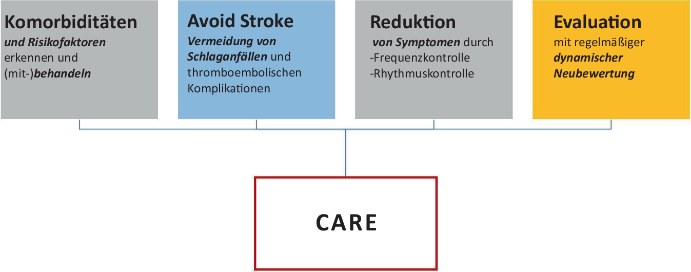 Das systematische und auf den Patienten ausgerichtete AF-CARE-Konzept berücksichtigt eine individualisierte, auf die Bedürfnisse des Patienten zugeschnittene Vorgehensweise bei der Behandlung der Arrhythmie [13]. Zudem wird der dynamischen Natur der Erkrankung, den Komorbiditäten und Risikofaktoren sowie der ständigen Verbesserung der Behandlungsoptionen von Vorhofflimmern Rechnung getragen für eine optimale Therapie.