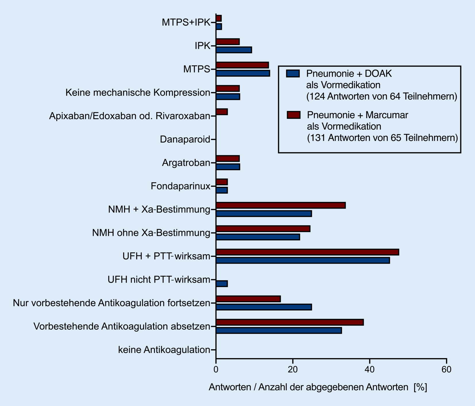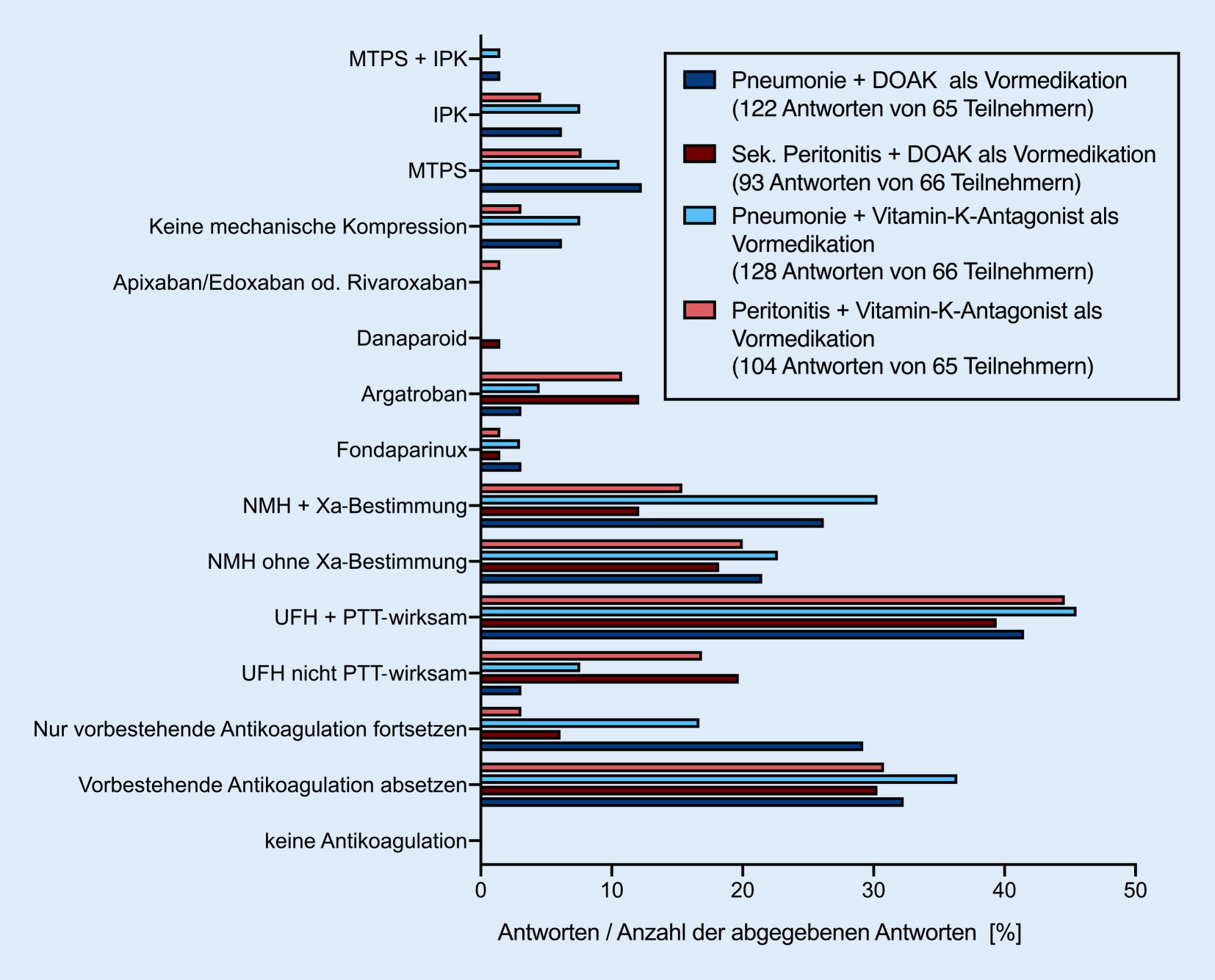 In einer Variation der Fallbeispiele von pneumogener und abdomineller Sepsis wurde nach dem Vorgehen bei Patienten gefragt, bei denen eine Antikoagulation mit direkten oralen Antikoagulanzien (DOAK; wie z. B. Faktor-Xa-Inhibitoren Apixaban [Eliquis®, Bristol-Myers Squibb, New York, USA, und Pfizer Pharma, New York, USA], Edoxaban [Lixiana®, Daiichi Sankyo Europe, Tokyo, Japan], Rivaroxaban [Xarelto®, Bayer AG, Leverkusen, Deutschland] oder der Thrombininhibitor Dabigatran[etexilat] [Pradaxa®, Boehringer Ingelheim, Ingelheim am Rhein, Deutschland]) oder Vitamin-K-Antagonisten (z. B. Marcumar®, MEDA Pharma, Bad Homburg, Deutschland) wegen Vorhofflimmerns oder als Sekundärprophylaxe bei einer zurückliegenden tiefen Beinvenenthrombose (TVT) oder Lungenarterienembolie (LAE) bestand.
