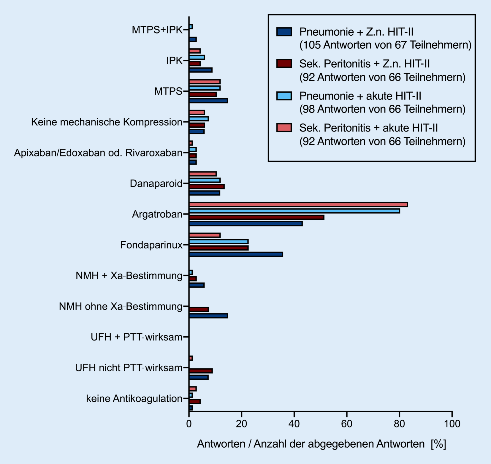 Sowohl bei pneumogener als auch bei abdomineller Sepsis gaben die meisten Teilnehmer im Rahmen von Freitextkommentaren an, im Falle einer Jahre zurückliegenden HIT-II Argatroban mit PTT-Zielwerten von < 40 s oder zwischen 40 und 60 s zu nutzen. In Intensivbereichen, in denen Fondaparinux genutzt wird, geschieht dies mit der empfohlenen prophylaktischen Dosierung von 2,5 mg/Tag. In Einzelfällen wurden auch andere Medikamente und Dosierungen genannt (vgl. ESM 6 – Freitextantworten zur Antikoagulation bei vorbestehender HIT-II).